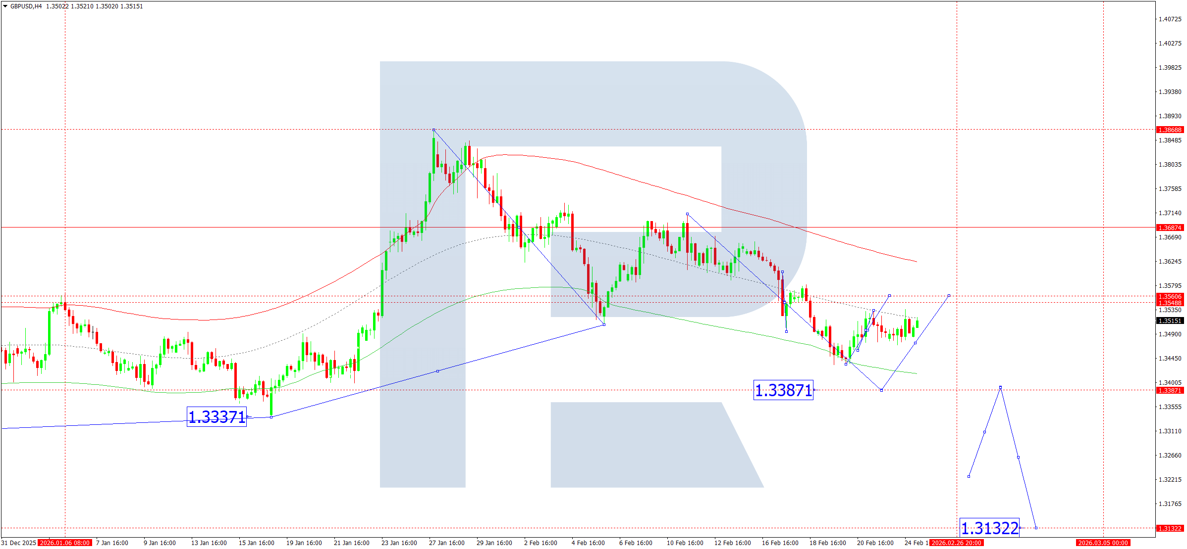 บนกราฟ H4 ของคู่ GBPUSD ตลาดได้ทะลุเหนือ 1.3500 และกำลังก่อตัวโครงสร้างคลื่นสู่ 1.3536 วันนี้ 25 กุมภาพันธ์ 2026 คาดว่าจะทดสอบเป้าหมายดังกล่าว จากนั้นจะปรับตัวลงต่อเนื่องสู่ 1.3391 หากระดับนี้ถูกทะลุ ศักยภาพสำหรับการเคลื่อนไหวสู่ 1.3222 จะเปิดขึ้น