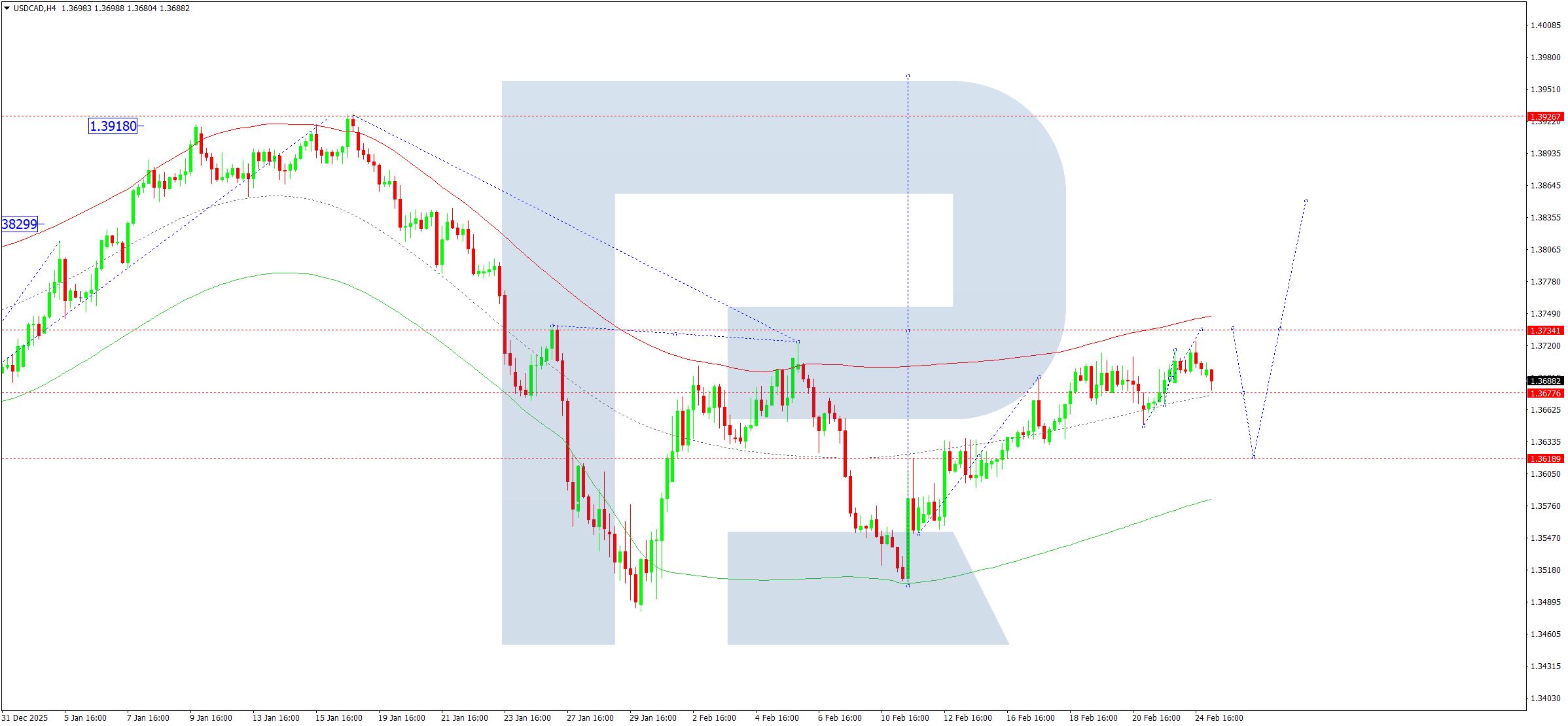 บนกราฟ H4 ของคู่ USDCAD ตลาดกำลังก่อตัวโครงสร้างขาขึ้นสู่ 1.3737 วันนี้ 25 กุมภาพันธ์ 2026 กำลังก่อตัวกรอบสะสมตัวบริเวณ 1.3690 คาดว่าจะปรับตัวลงสู่ 1.3670 จากนั้นกลับมาปรับตัวขึ้นสู่ 1.3737 หลังจากนั้นอาจเกิดการปรับฐานสู่ 1.3636