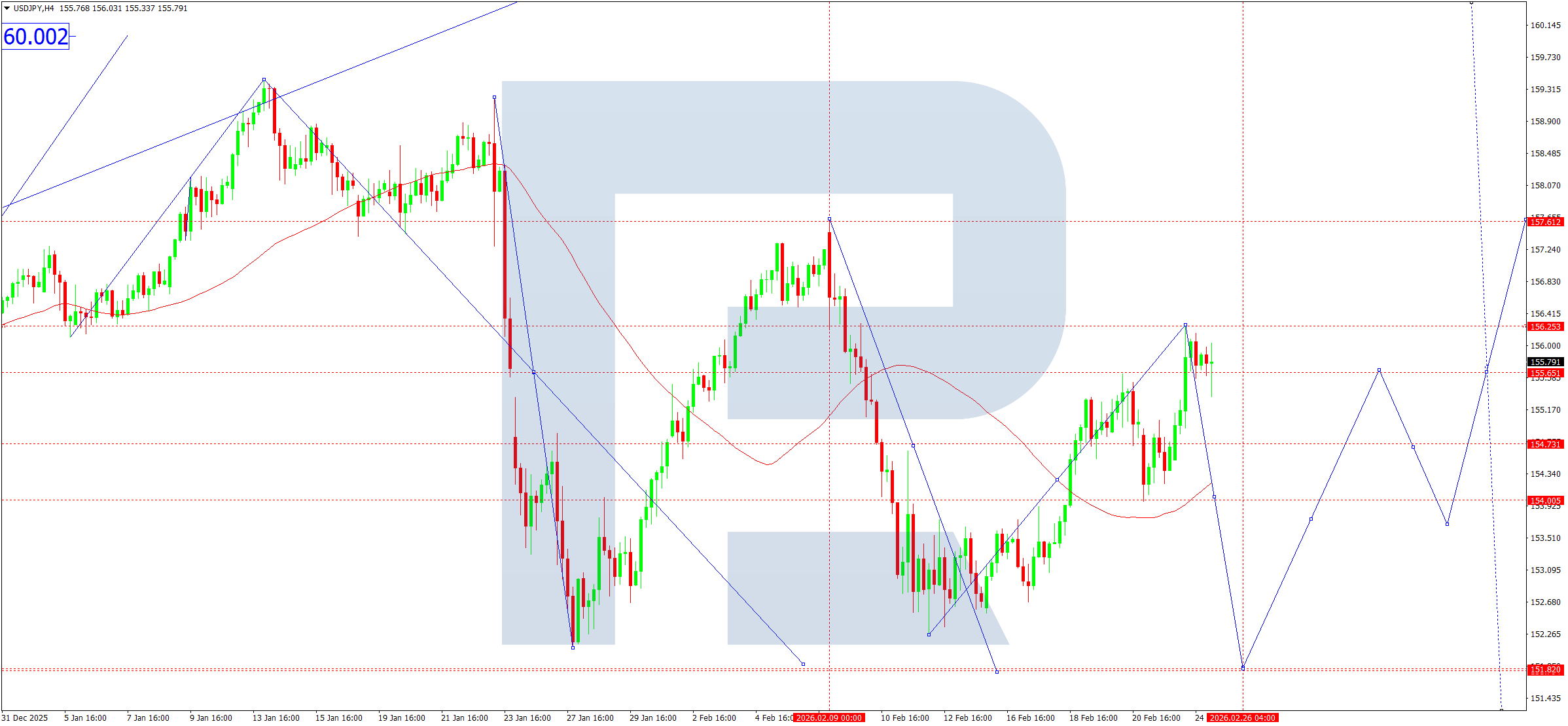 อินดิเคเตอร์ทางเทคนิคสำหรับการคาดการณ์ USDJPY วันนี้ชี้ให้พิจารณาความเป็นไปได้ของการปรับตัวลงสู่ 154.00