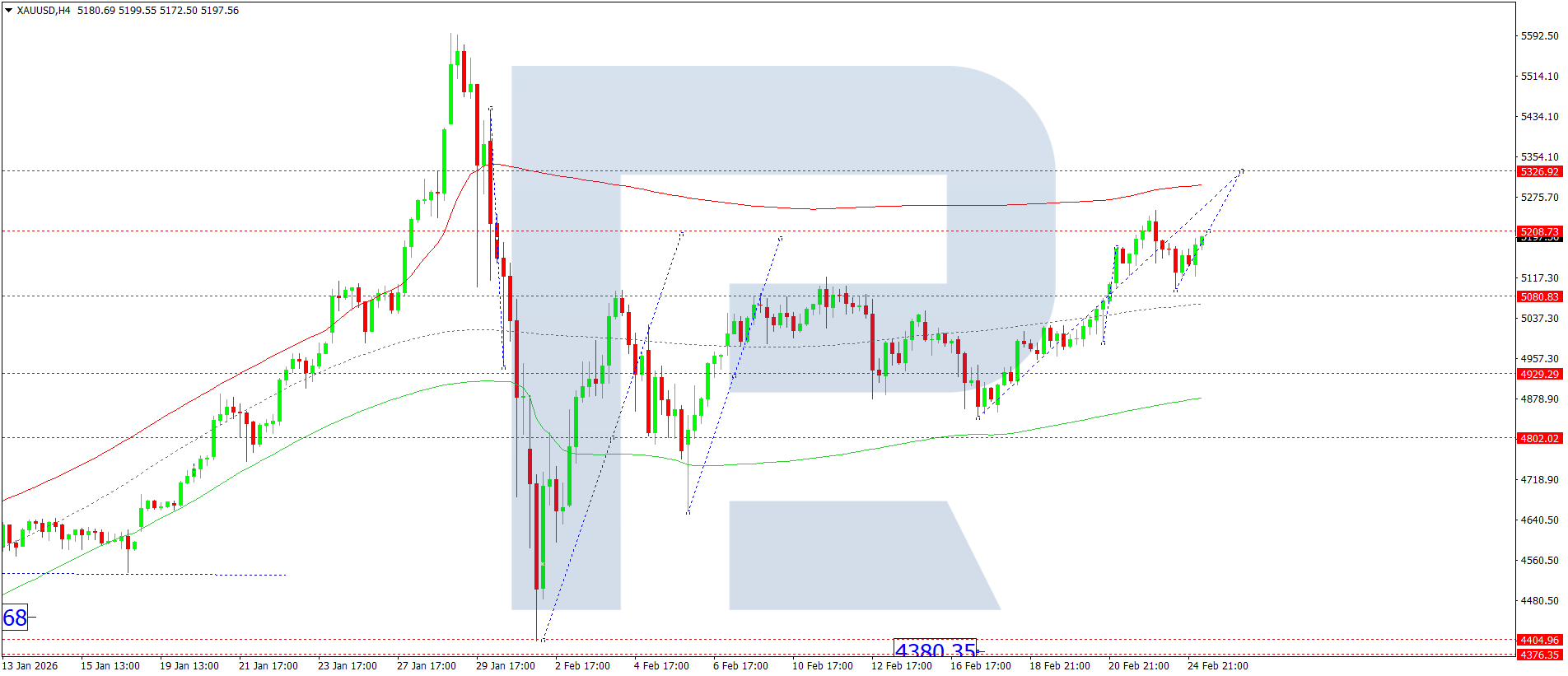 บนกราฟ H4 ของ XAUUSD ตลาดกำลังก่อตัวคลื่นขาขึ้นสู่ 5326 วันนี้ 25 กุมภาพันธ์ 2026 คาดว่าจะทดสอบเป้าหมายดังกล่าว จากนั้นจะพิจารณาความเป็นไปได้ของการเริ่มต้นการปรับตัวลงสู่ 5080 หากระดับนี้ถูกทะลุ ศักยภาพสำหรับการเคลื่อนไหวสู่ 4930 จะเปิดขึ้น