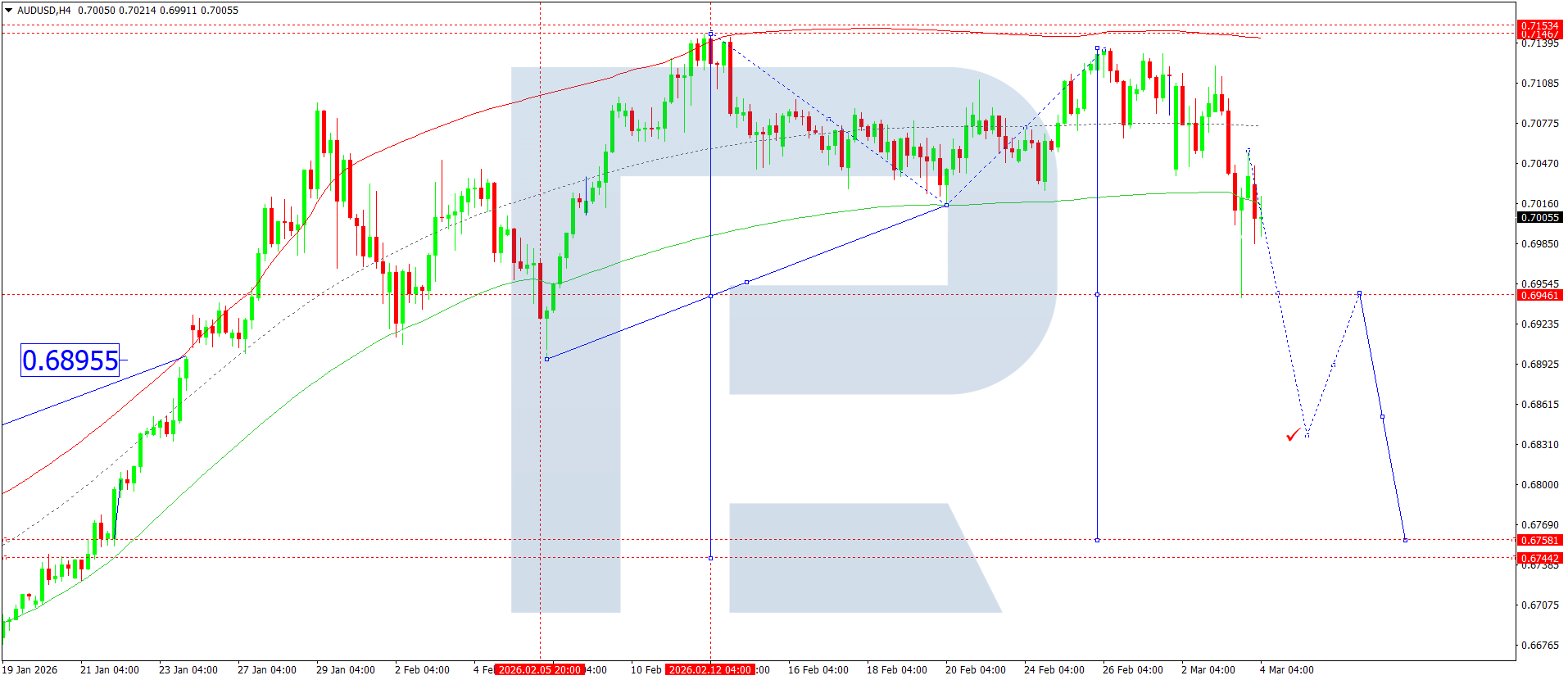 บนกราฟ H4 ของคู่เงิน AUDUSD ตลาดได้ทะลุลงต่ำกว่า 0.704 และเสร็จสิ้นคลื่นขาลง โดยลงไปถึง 0.6940 วันนี้ 4 มีนาคม 2026 การปรับฐานขึ้นไปยัง 0.7055 ได้เสร็จสิ้นแล้ว และคลื่นขาลงยังคงดำเนินต่อไปยัง 0.6848 จากนั้นอาจก่อตัวช่วงการแกว่งตัวสะสมรอบระดับนี้ ก่อนที่คู่เงินจะปรับตัวลงไปยัง 0.6755 ซึ่งเป็นเป้าหมายระยะสั้น