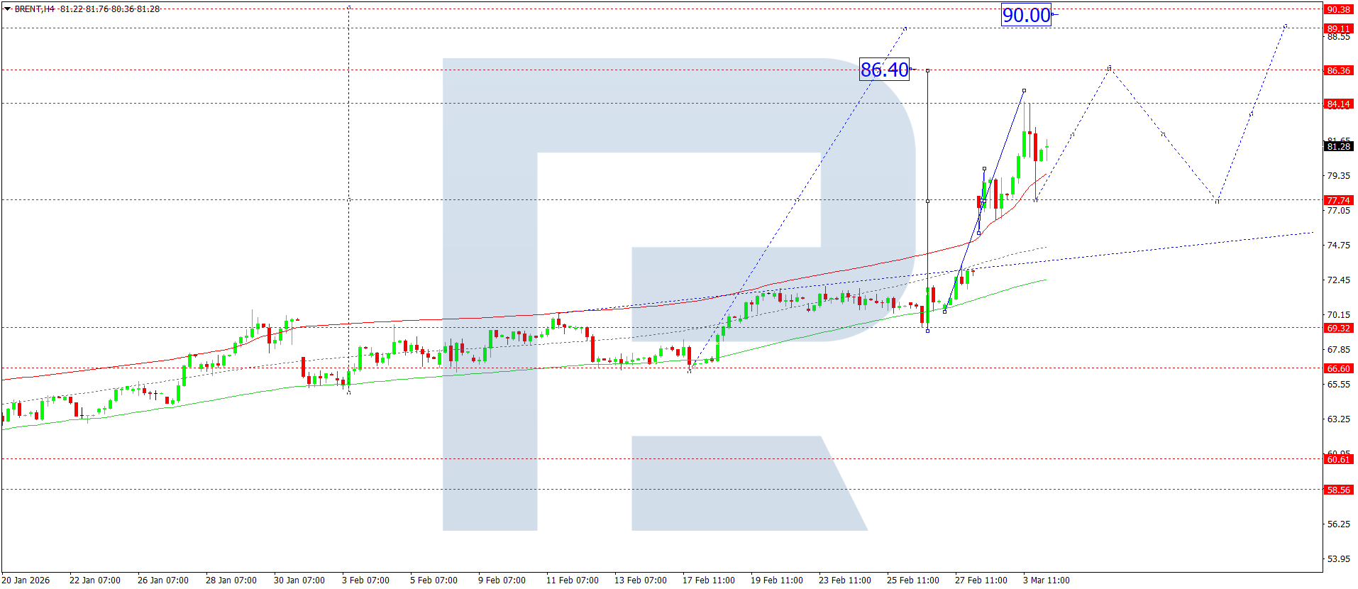 บนกราฟ H4 ของน้ำมันดิบ Brent ตลาดได้ทะลุขึ้นเหนือ 80.00 และเสร็จสิ้นคลื่นขาขึ้นไปยัง 84.14 วันนี้ 4 มีนาคม 2026 การปรับฐานลงไปยัง 77.77 ได้เสร็จสิ้นแล้ว จากนั้นมีโอกาสปรับตัวขึ้นไปยัง 85.00 พร้อมแนวโน้มต่อเนื่องไปยัง 86.40