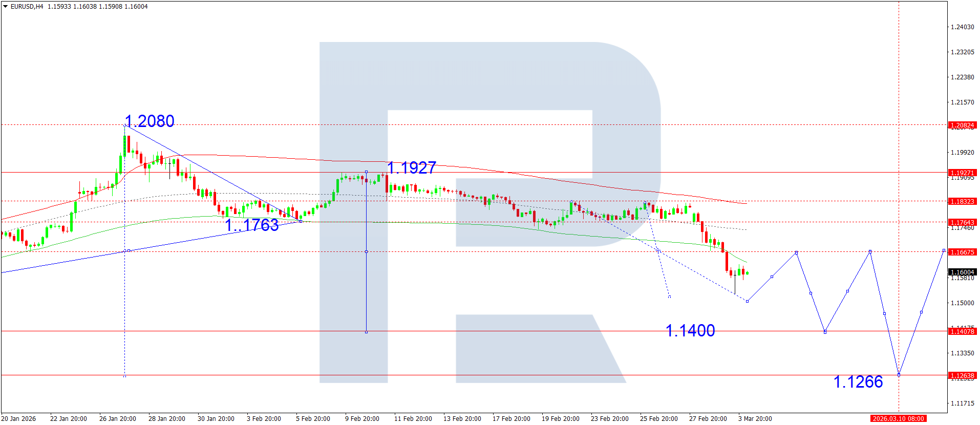 บนกราฟ H4 ของคู่เงิน EURUSD ตลาดได้ทะลุลงต่ำกว่า 1.1666 และเสร็จสิ้นโครงสร้างคลื่นขาลง โดยลงไปถึง 1.1530 วันนี้ 4 มีนาคม 2026 คาดว่าจะปรับตัวลงต่อไปยัง 1.1500 จากนั้นมีโอกาสเกิดการปรับฐานขึ้นไปยัง 1.1666 และอาจปรับตัวลงต่อไปยัง 1.1400 ซึ่งเป็นเป้าหมายระยะสั้น ต่อจากนั้นอาจพัฒนาเป็นการปรับฐานขึ้นไปยัง 1.1700