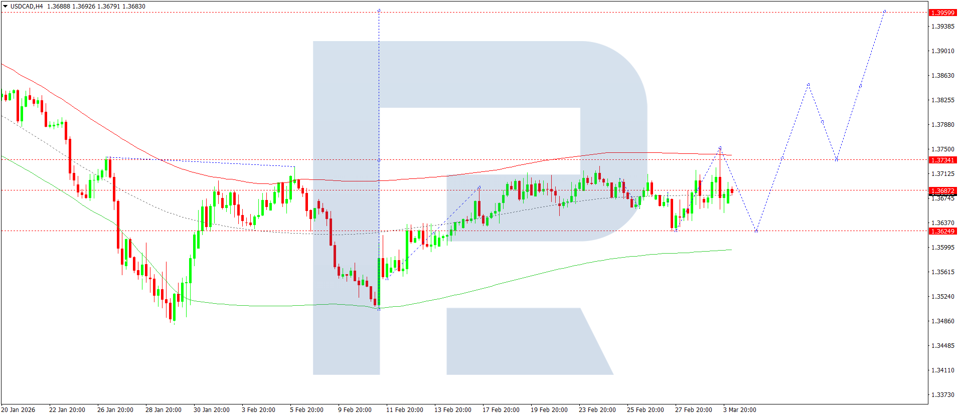 บนกราฟ H4 ของคู่เงิน USDCAD ตลาดได้เสร็จสิ้นคลื่นขาขึ้นไปยัง 1.3750 วันนี้ 4 มีนาคม 2026 มีโอกาสเกิดการปรับฐานลงไปยัง 1.3630 หลังจากการปรับฐานเสร็จสิ้น คาดว่าจะทะลุขึ้นเหนือ 1.3737 ซึ่งจะเปิดศักยภาพของคลื่นไปยัง 1.3850 พร้อมโอกาสต่อเนื่องของแนวโน้มไปยัง 1.3950