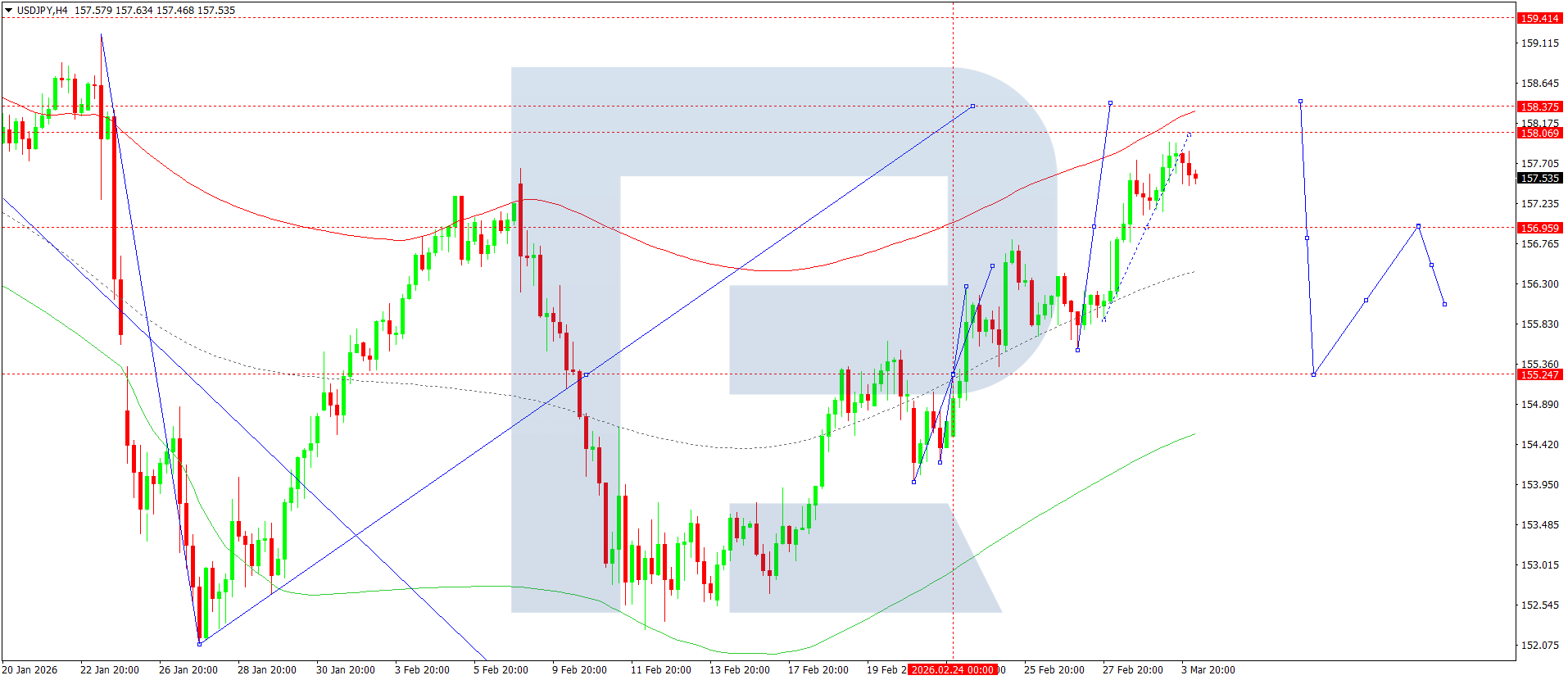 ตัวชี้วัดทางเทคนิคสำหรับการคาดการณ์ USDJPY วันนี้ชี้ถึงโอกาสการปรับตัวขึ้นไปยัง 158.08