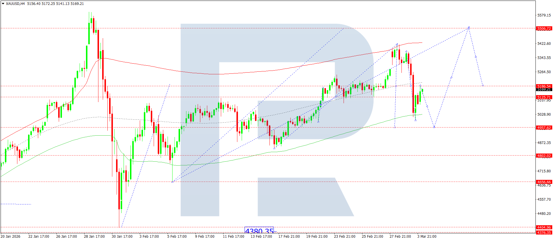 บนกราฟ H4 ของ XAUUSD ตลาดได้เสร็จสิ้นคลื่นขาลงไปยัง 5,000 วันนี้ 4 มีนาคม 2026 คาดว่าจะก่อตัวช่วงการแกว่งตัวสะสมเหนือระดับ 5,136 หากทะลุกรอบขึ้นด้านบน จะเปิดทางให้คลื่นไปยัง 5,246 ในทางกลับกัน หากทะลุลงด้านล่าง อาจกระตุ้นการปรับตัวลงไปยัง 4,957