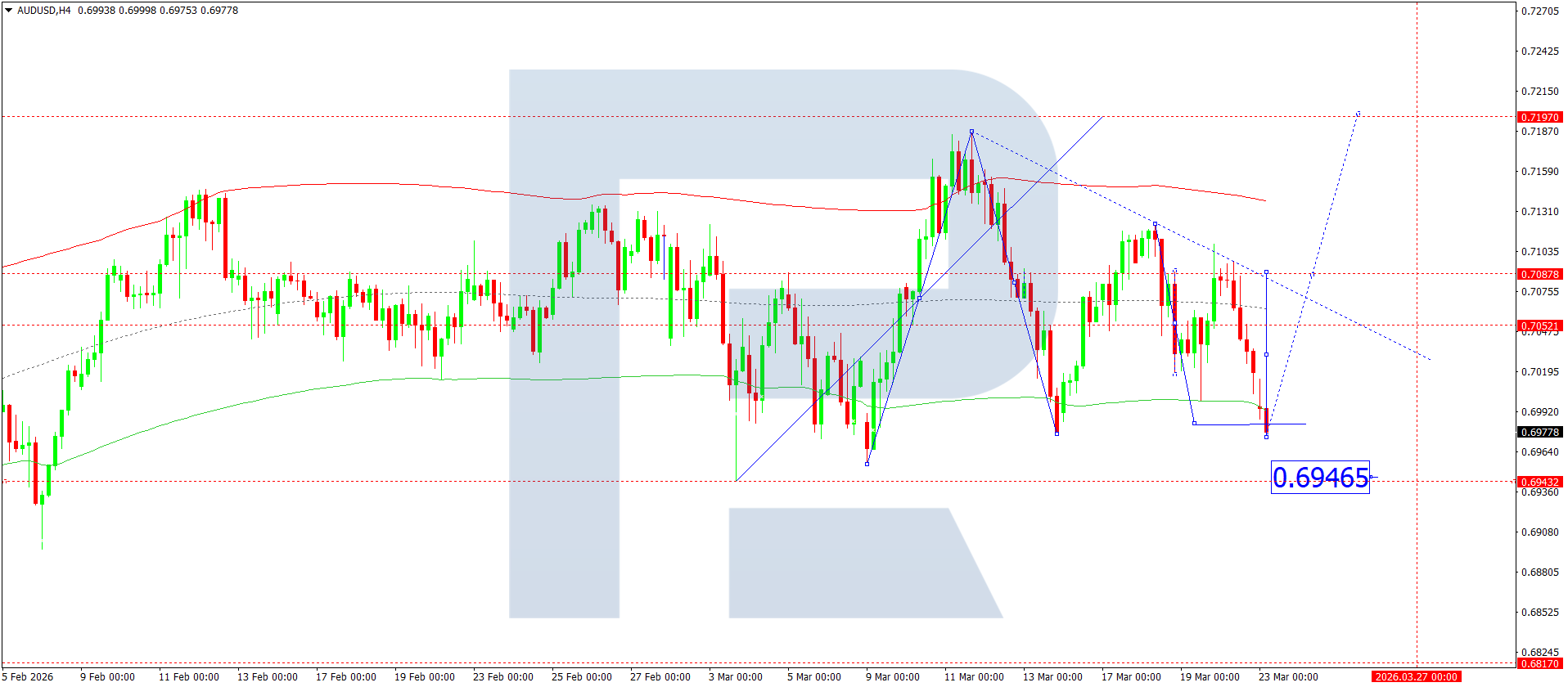 บนกราฟ H4 ของคู่เงิน AUDUSD ตลาดได้ทะลุต่ำกว่า 0.6982 และยังคงพัฒนาโครงสร้างไปยัง 0.6920 วันนี้ 23 มีนาคม 2026 คาดว่าจะเกิดช่วงการแกว่งตัวสะสมรอบระดับนี้ หากทะลุลงด้านล่าง คาดว่าจะเกิดการเคลื่อนไหวต่อไปยัง 0.6900 ในขณะที่การทะลุขึ้นจะเปิดศักยภาพของคลื่นขาขึ้นไปยัง 0.6800