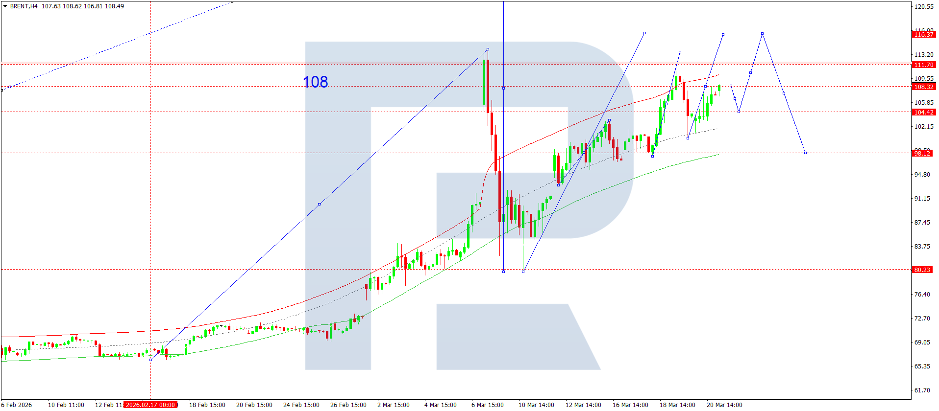 บนกราฟ H4 ของน้ำมันดิบ Brent ตลาดได้เสร็จสิ้นโครงสร้างคลื่นขาขึ้น โดยแตะระดับ 108.60 วันนี้ 23 มีนาคม 2026 คาดว่าจะเกิดการปรับฐานลงไปยัง 104.40 หลังจากนั้นมีแนวโน้มที่จะเริ่มคลื่นขาขึ้นใหม่ โดยมีเป้าหมายที่ 116.37 ซึ่งเป็นเป้าหมายระยะสั้น