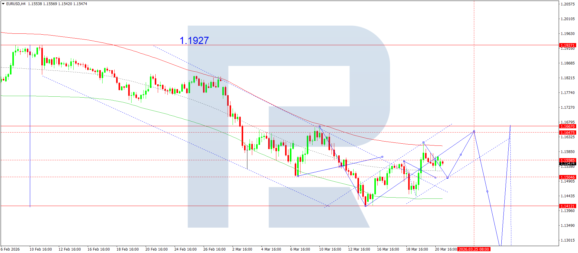 บนกราฟ H4 ของคู่เงิน EURUSD ตลาดได้เสร็จสิ้นคลื่นขาลงไปยัง 1.1525 และปรับตัวขึ้นไปยัง 1.1570 วันนี้ 23 มีนาคม 2026 โดยในทางปฏิบัติ ตลาดได้ก่อตัวช่วงการแกว่งตัวสะสมระหว่างระดับเหล่านี้แล้ว หากทะลุขึ้น จะเปิดศักยภาพของการปรับฐานต่อเนื่องไปยัง 1.1647 ในขณะที่การทะลุลงด้านล่างอาจทำให้คลื่นขาลงขยายไปยัง 1.1266
