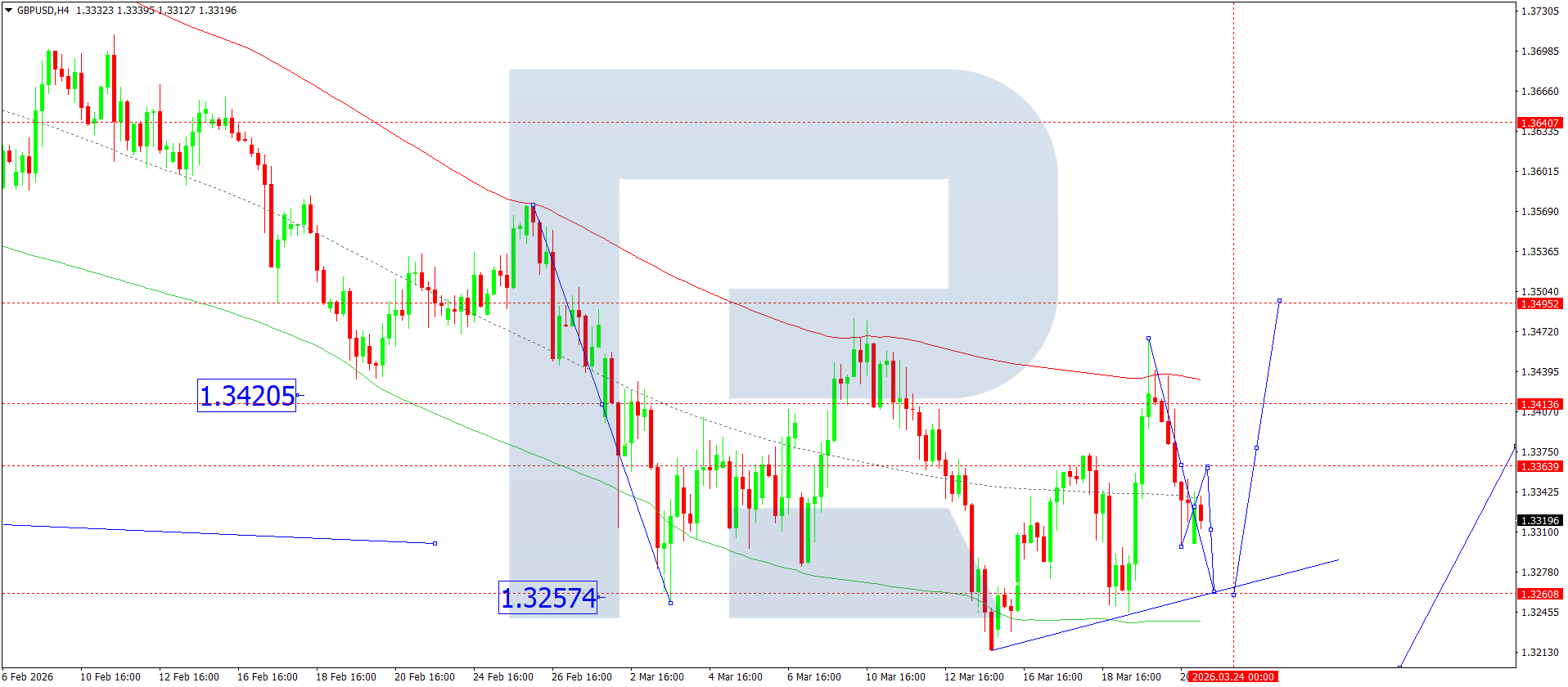 บนกราฟ H4 ของคู่เงิน GBPUSD ตลาดได้ก่อตัวคลื่นขาลง โดยแตะระดับ 1.3300 วันนี้ 23 มีนาคม 2026 คาดว่าการปรับตัวลงจะดำเนินต่อไปยัง 1.3262 หลังจากนั้นอาจเกิดช่วงการแกว่งตัวสะสมเหนือระดับนี้ หากทะลุลงด้านล่าง จะเปิดศักยภาพของการปรับตัวลงไปยัง 1.3200 ในขณะที่การทะลุขึ้นจะเปิดทางไปยัง 1.3494 ซึ่งเป็นเป้าหมายระยะสั้น หลังจากถึงระดับนี้ ไม่ตัดความเป็นไปได้ของการปรับตัวลงไปยัง 1.3354