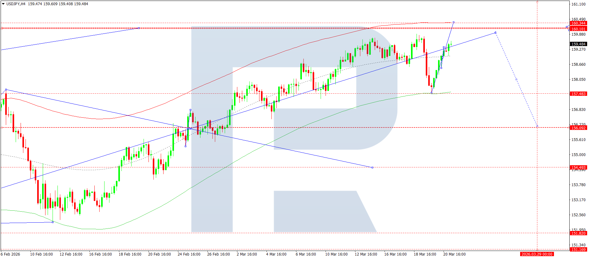 บนกราฟ H4 ของคู่เงิน USDJPY ตลาดได้ทะลุขึ้นเหนือ 159.00 และเสร็จสิ้นคลื่นขาขึ้นไปยัง 159.60 วันนี้ 23 มีนาคม 2026 คาดว่าคลื่นขาขึ้นจะดำเนินต่อไปยัง 160.30 ต่อมาอาจเกิดช่วงการแกว่งตัวสะสมรอบระดับนี้ หากทะลุขึ้น จะเปิดศักยภาพของการเคลื่อนไหวไปยัง 161.00 ในขณะที่การทะลุลงด้านล่างอาจกระตุ้นการปรับฐานไปยัง 156.10