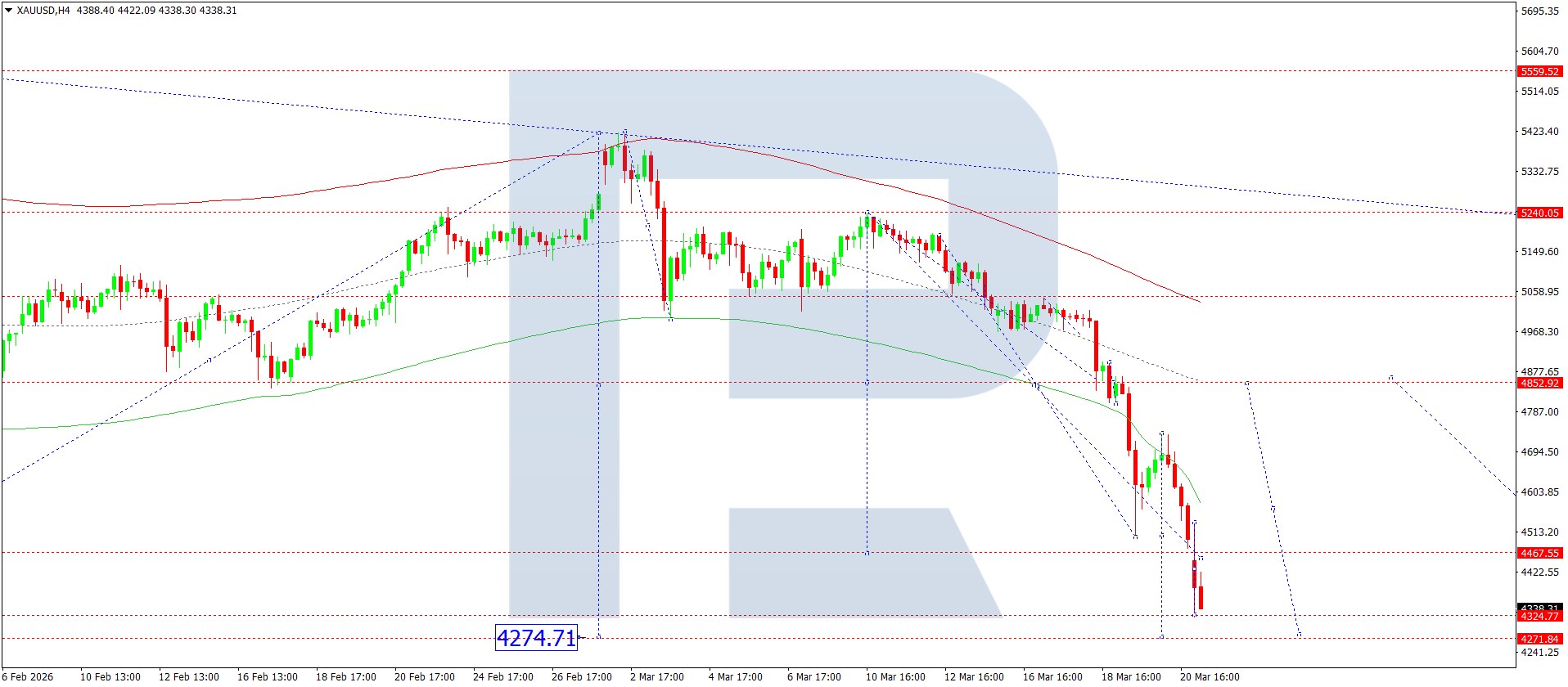 บนกราฟ H4 ของ XAUUSD ตลาดได้ทะลุต่ำกว่า 4,500 และยังคงก่อตัวคลื่นขาลงไปยัง 4,272 วันนี้ 23 มีนาคม 2026 คาดว่าจะเริ่มต้นคลื่นขาขึ้น โดยมีเป้าหมายที่ 4,800 พร้อมโอกาสที่แนวโน้มจะดำเนินต่อไปยัง 4,850 ในสถานการณ์ทางเลือก หากเกิดการทะลุลงด้านล่างอีกครั้ง อาจทำให้ราคาปรับตัวลงไปยัง 4,200
