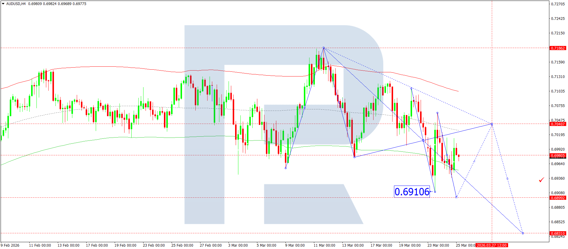บนกราฟ H4 ของคู่เงิน AUDUSD ตลาดได้ทะลุต่ำกว่า 0.7007 และยังคงพัฒนาโครงสร้างไปยัง 0.6899 วันนี้ 25 มีนาคม 2026 คาดว่าจะเกิดช่วงการแกว่งตัวสะสมรอบระดับนี้ หากทะลุลงด้านล่าง คาดว่าจะปรับตัวลงไปยัง 0.6830 ในขณะที่หากทะลุขึ้น จะเปิดศักยภาพของคลื่นขาขึ้นไปยัง 0.7008