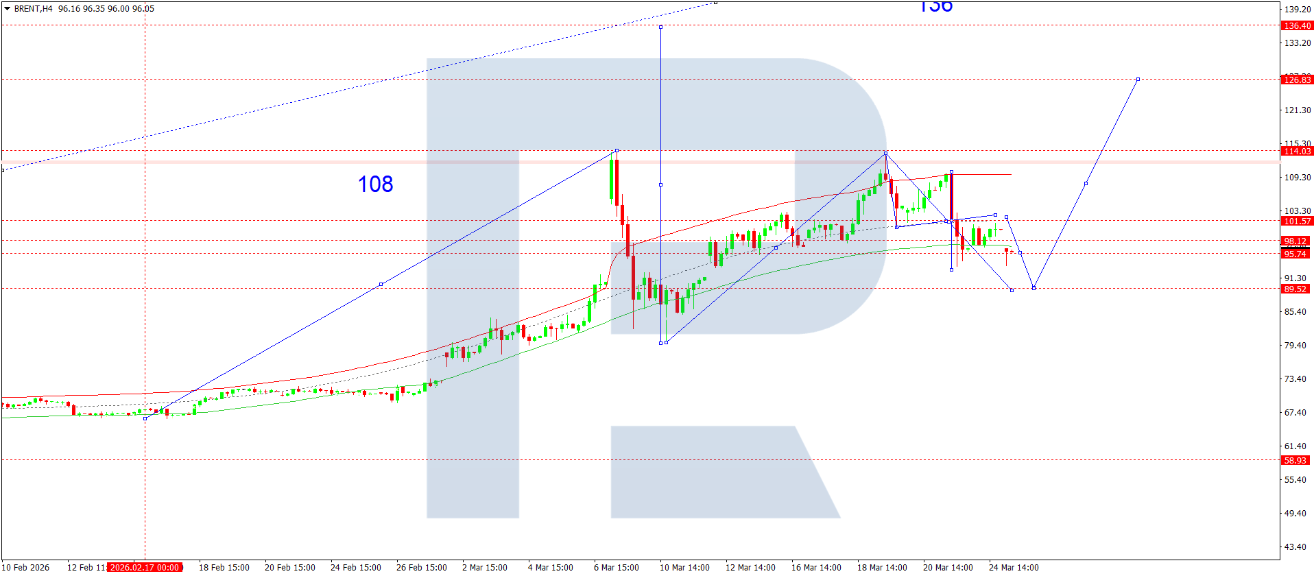 บนกราฟ H4 ของน้ำมันดิบ Brent ตลาดได้เสร็จสิ้นโครงสร้างคลื่นขาลงไปยัง 93.73 วันนี้ 25 มีนาคม 2026 จะพิจารณาความเป็นไปได้ของการปรับตัวลงไปยัง 90.00 ก่อน จากนั้นคาดว่าจะปรับตัวขึ้นไปยัง 103.00 พร้อมแนวโน้มต่อเนื่องไปยัง 108.88 ซึ่งเป็นเป้าหมายระยะสั้น