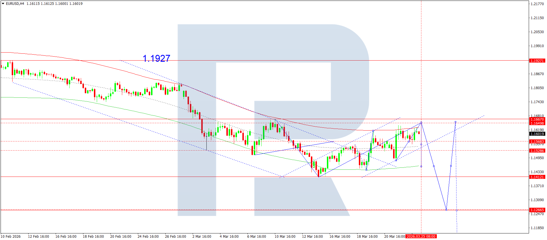 บนกราฟ H4 ของคู่เงิน EURUSD ตลาดได้เสร็จสิ้นคลื่นขาลงไปยัง 1.1553 และคลื่นขาขึ้นไปยัง 1.1625 วันนี้ 25 มีนาคม 2026 ได้ก่อตัวช่วงการแกว่งตัวสะสมรอบระดับ 1.1566 แล้ว หากทะลุขึ้น จะเปิดศักยภาพของการปรับฐานต่อเนื่องไปยัง 1.1650 ในขณะที่หากราคาทะลุลงด้านล่าง ไม่สามารถตัดความเป็นไปได้ของการขยายคลื่นขาลงไปยัง 1.1455 พร้อมแนวโน้มต่อเนื่องไปยัง 1.1266