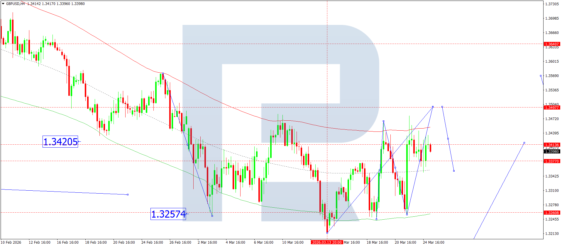 บนกราฟ H4 ของคู่เงิน GBPUSD ตลาดได้ก่อตัวคลื่นขาขึ้นไปยัง 1.3434 วันนี้ 24 มีนาคม 2026 คาดว่าจะปรับตัวลงไปยัง 1.3355 หลังจากนั้นจะพิจารณาความเป็นไปได้ของการก่อตัวช่วงการแกว่งตัวสะสมเหนือระดับนี้ หากทะลุลงด้านล่าง จะเปิดศักยภาพของการปรับตัวลงไปยัง 1.3200 ในขณะที่หากทะลุขึ้น จะเปิดศักยภาพของการเคลื่อนไหวไปยัง 1.3494 ซึ่งเป็นเป้าหมายระยะสั้น หลังจากถึงระดับนี้ ไม่ตัดความเป็นไปได้ของการปรับตัวลงไปยัง 1.3355