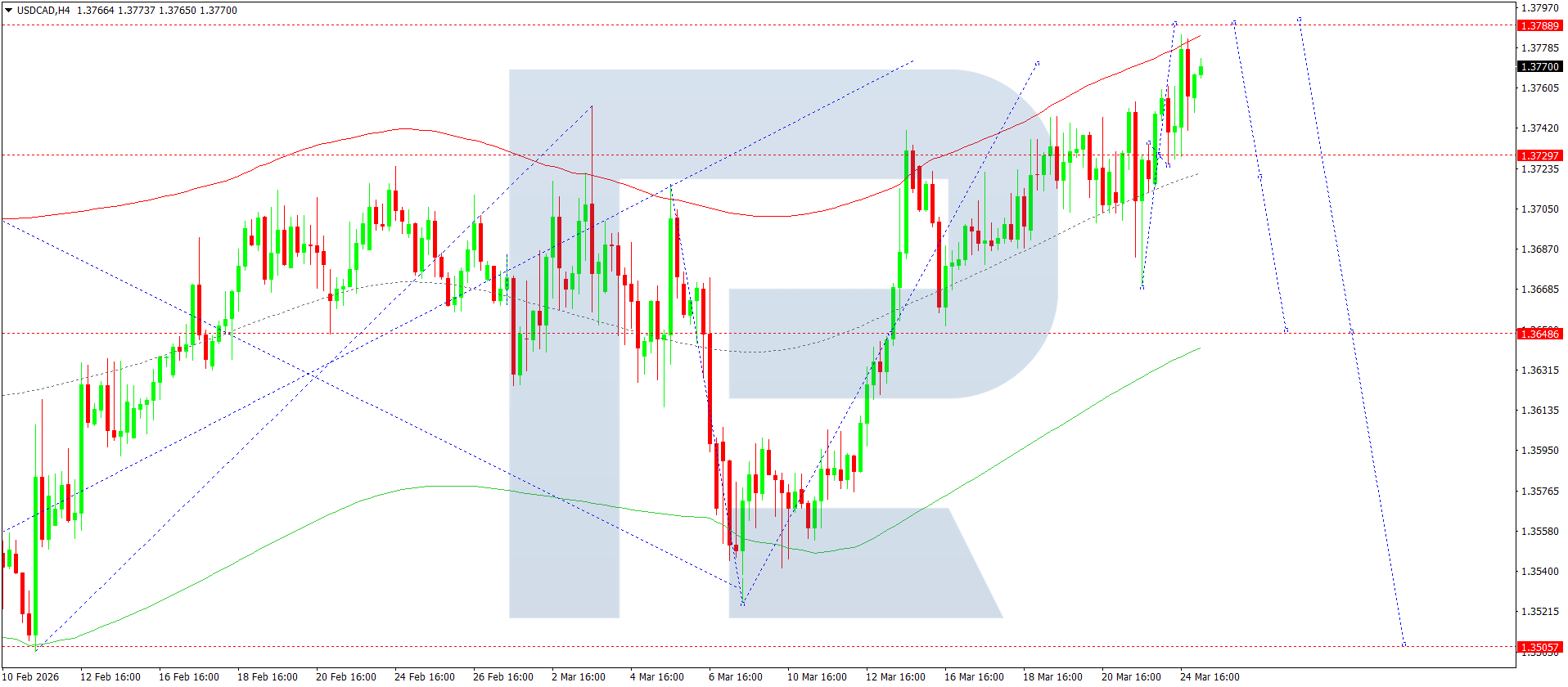 บนกราฟ H4 ของคู่เงิน USDCAD ตลาดกำลังก่อตัวโครงสร้างคลื่นขาขึ้นไปยัง 1.3788 วันนี้ 25 มีนาคม 2026 คาดว่าจะปรับตัวขึ้นไปยัง 1.3788 หลังจากนั้นอาจปรับตัวลงไปยัง 1.3646