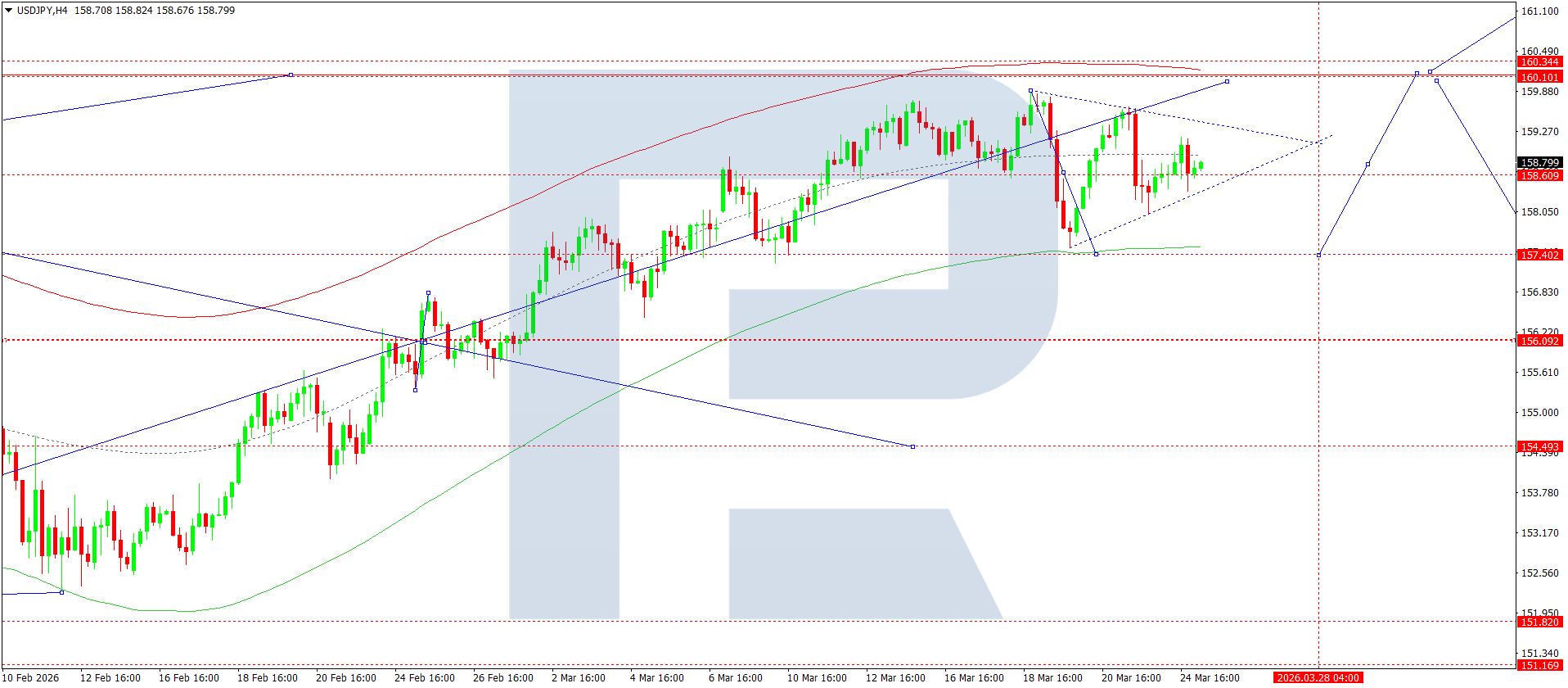 บนกราฟ H4 ของคู่เงิน USDJPY ตลาดได้ทะลุขึ้นเหนือ 158.50 และเสร็จสิ้นคลื่นขาขึ้นไปยัง 159.20 วันนี้ 25 มีนาคม 2026 คาดว่าจะปรับตัวลงไปยัง 158.60 จากนั้นคาดว่าจะเกิดช่วงการแกว่งตัวสะสมรอบระดับนี้ หากทะลุขึ้น จะเปิดศักยภาพของการเคลื่อนไหวไปยัง 160.10 ในขณะที่หากราคาทะลุลงด้านล่าง จะพิจารณาคลื่นปรับฐานไปยัง 157.40