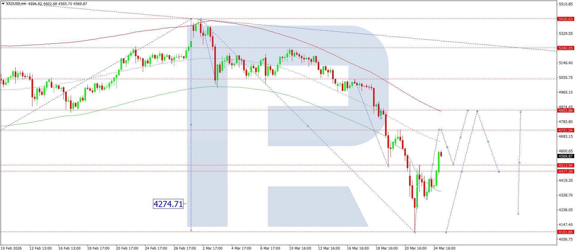 บนกราฟ H4 ของ XAUUSD ตลาดได้ทะลุขึ้นเหนือ 4500 และยังคงก่อตัวคลื่นขาขึ้นไปยัง 4730 วันนี้ 25 มีนาคม 2026 คาดว่าจะถึงระดับเป้าหมายนี้ จากนั้นจะพิจารณาการเริ่มต้นของคลื่นขาลงไปยัง 4515 พร้อมแนวโน้มต่อเนื่องไปยัง 4666 ในสถานการณ์ทางเลือก หากทะลุขึ้นต่อ อาจเกิดคลื่นขาขึ้นอีกครั้งไปยัง 4737 ซึ่งเป็นเป้าหมายระยะสั้น