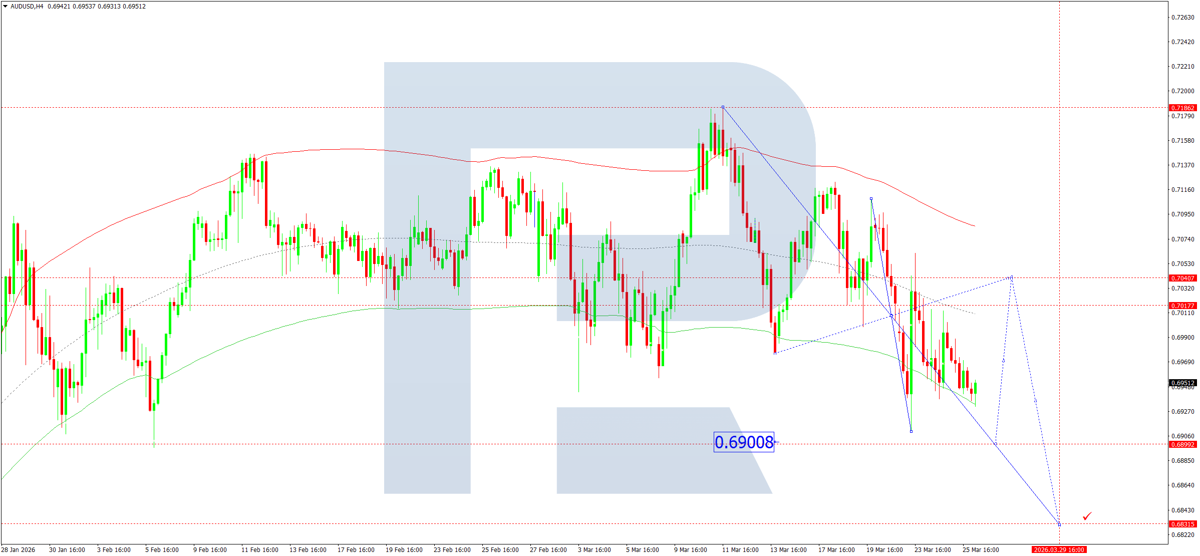 บนกราฟ H4 ของคู่เงิน AUDUSD ตลาดได้ทะลุต่ำกว่า 0.6950 และยังคงพัฒนาโครงสร้างไปยัง 0.6899 วันนี้ 26 มีนาคม 2026 คาดว่าจะเกิดช่วงการแกว่งตัวสะสมรอบระดับนี้ หากทะลุลงด้านล่าง อาจทำให้ราคาปรับตัวลงไปยัง 0.6830 ในขณะที่หากทะลุขึ้น จะเปิดศักยภาพของคลื่นขาขึ้นไปยัง 0.7008
