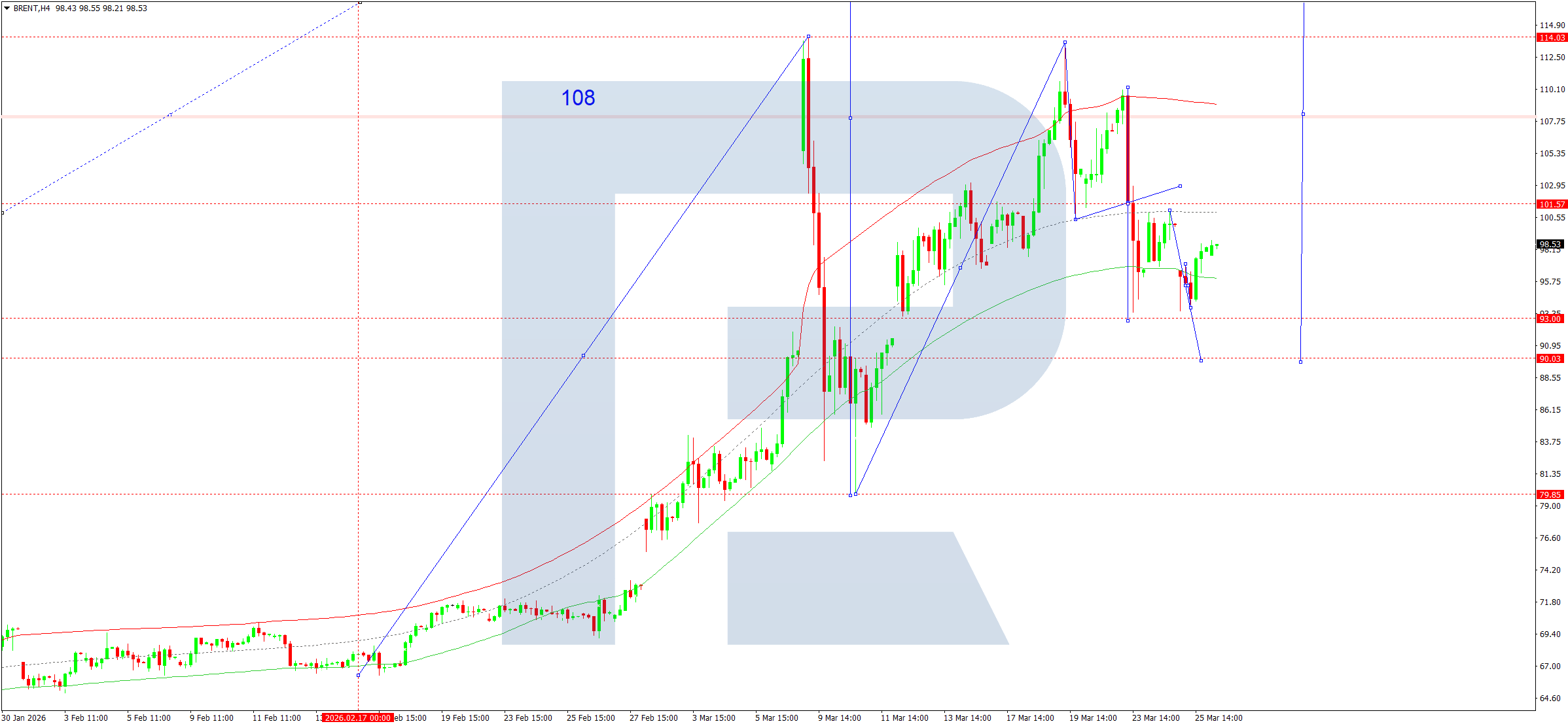 บนกราฟ H4 ของน้ำมันดิบ Brent ตลาดได้เสร็จสิ้นโครงสร้างคลื่นขาลง โดยแตะระดับ 93.59 วันนี้ 26 มีนาคม 2026 คาดว่าจะปรับตัวขึ้นไปยัง 101.60 หากทะลุระดับนี้ จะเปิดทางไปยัง 103.00 และอาจต่อเนื่องไปยังเป้าหมายระยะสั้นที่ 108.88
