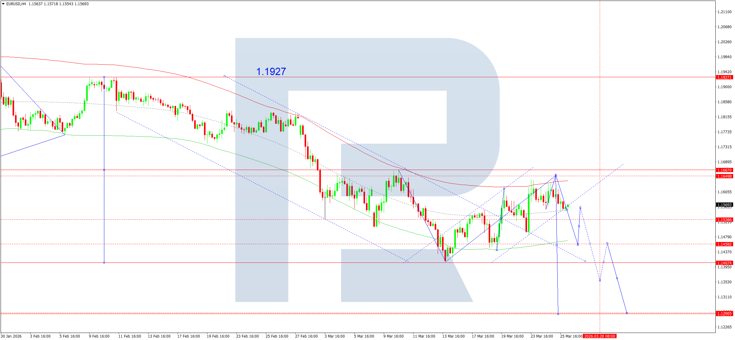 บนกราฟ H4 ของคู่เงิน EURUSD ตลาดได้เสร็จสิ้นคลื่นขาลง โดยแตะระดับ 1.1543 วันนี้ 26 มีนาคม 2026 คาดว่าจะเกิดช่วงการแกว่งตัวสะสมรอบระดับนี้ หากทะลุขึ้น จะเปิดศักยภาพของการปรับฐานต่อเนื่องไปยัง 1.1650 ในขณะที่การทะลุลงด้านล่างอาจทำให้คลื่นขาลงขยายไปยัง 1.1455 และมีโอกาสลงต่อไปยัง 1.1266