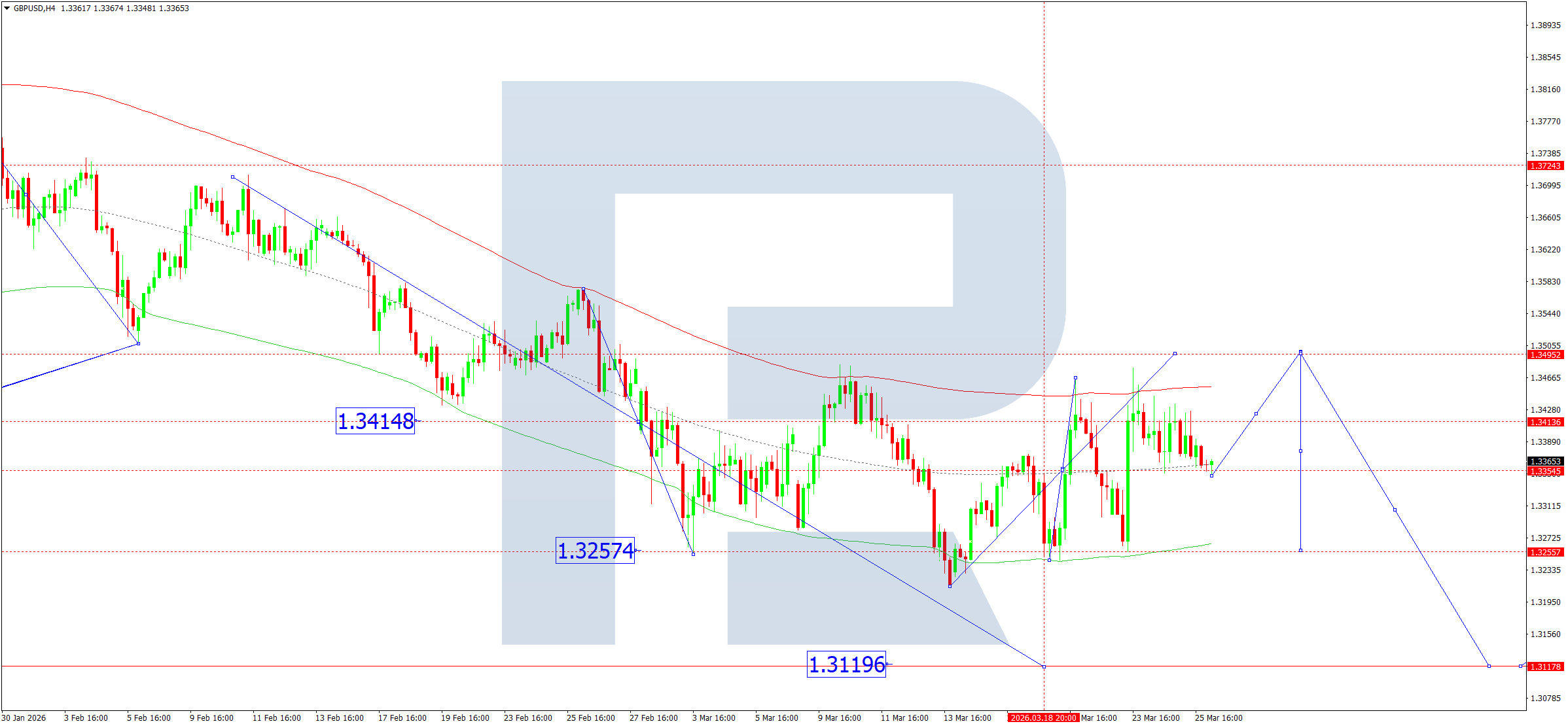 บนกราฟ H4 ของคู่เงิน GBPUSD ตลาดได้ก่อตัวคลื่นขาลงไปยัง 1.3355 วันนี้ 26 มีนาคม 2026 คาดว่าจะเกิดช่วงการแกว่งตัวสะสมเหนือระดับนี้ หากทะลุลงด้านล่าง จะเปิดทางไปยัง 1.3255 ในขณะที่หากทะลุขึ้น คู่เงินอาจปรับตัวขึ้นไปยังเป้าหมายระยะสั้นที่ 1.3494 หลังจากถึงระดับนี้ ราคามีโอกาสปรับตัวลงไปยัง 1.3255
