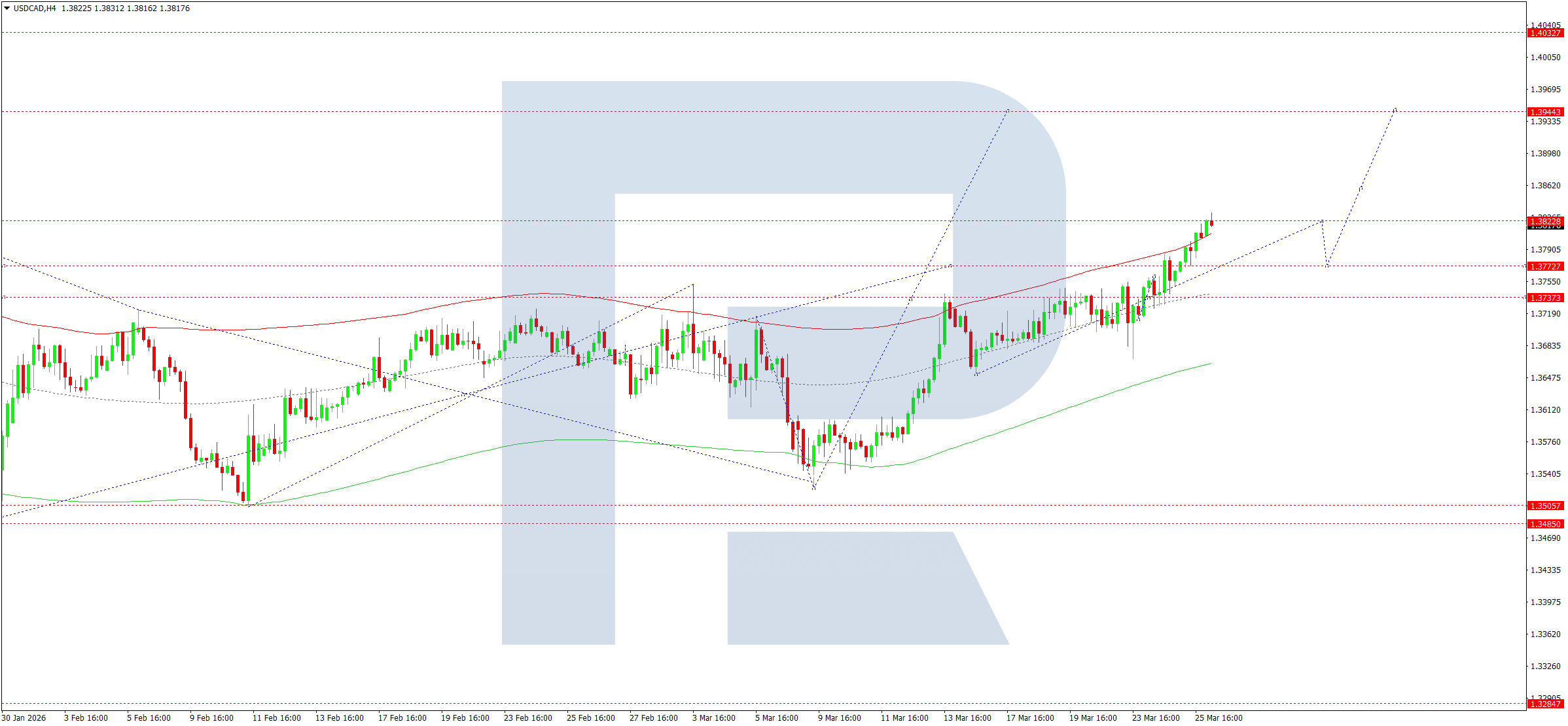 บนกราฟ H4 ของคู่เงิน USDCAD ตลาดกำลังก่อตัวโครงสร้างคลื่นขาขึ้นไปยัง 1.3944 วันนี้ 26 มีนาคม 2026 อาจเกิดการปรับฐานลงไปยัง 1.3777 ก่อน จากนั้นคาดว่าจะปรับตัวขึ้นไปยัง 1.3944