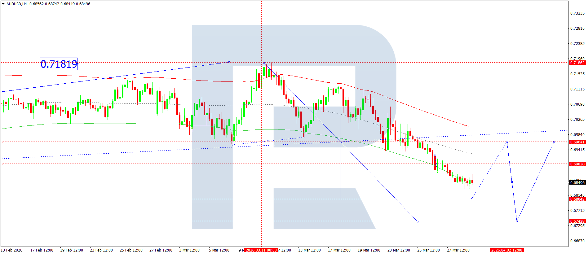 บนกราฟ H4 ของคู่เงิน AUDUSD ตลาดได้ทะลุต่ำกว่า 0.6868 และกำลังก่อตัวโครงสร้างคลื่นขาลงไปยัง 0.6800 วันนี้ 31 มีนาคม 2026 คาดว่าจะเกิดช่วงการแกว่งตัวสะสมรอบระดับ 0.6840 หากทะลุลง จะคาดว่าจะปรับตัวลงไปยัง 0.6800 ในขณะที่หากทะลุขึ้น จะเปิดศักยภาพของคลื่นขาขึ้นไปยัง 0.6940