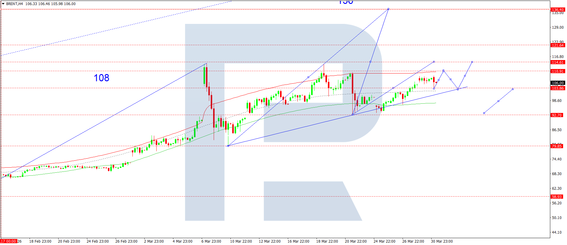 บนกราฟ H4 ของน้ำมันดิบ Brent ตลาดได้เสร็จสิ้นโครงสร้างคลื่นขาขึ้นไปที่ 108.88 วันนี้ 31 มีนาคม 2026 พิจารณาการก่อตัวของช่วงการแกว่งตัวสะสมใต้ระดับนี้ หากทะลุขึ้น จะเปิดศักยภาพของการปรับตัวขึ้นไปยัง 114.60 และอาจต่อเนื่องไปยัง 136.40 ซึ่งเป็นเป้าหมายระยะสั้น ในขณะที่หากทะลุลง อาจเกิดการปรับฐานไปยัง 103.00 ก่อนจะปรับตัวขึ้นไปยัง 114.60