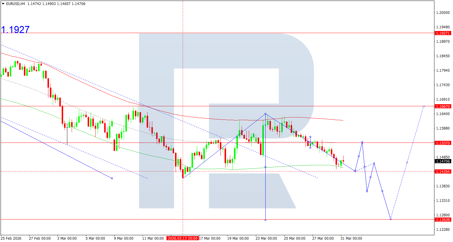 บนกราฟ H4 ของคู่เงิน EURUSD ตลาดได้เสร็จสิ้นคลื่นขาลงไปที่ 1.1443 วันนี้ 31 มีนาคม 2026 คาดว่าจะเกิดช่วงการแกว่งตัวสะสมรอบระดับนี้ หากทะลุขึ้น จะเปิดศักยภาพของการปรับฐานต่อเนื่องไปยัง 1.1500 ในขณะที่หากทะลุลง อาจเกิดการขยายตัวของคลื่นขาลงไปยัง 1.1434 และมีโอกาสต่อเนื่องไปยัง 1.1360