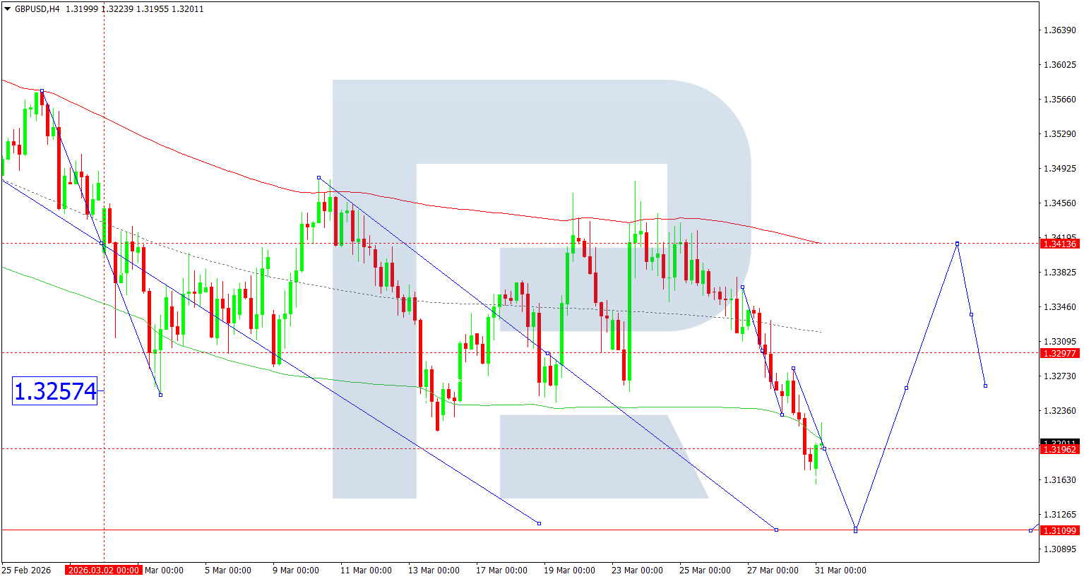 บนกราฟ H4 ของคู่เงิน GBPUSD ตลาดได้ก่อตัวคลื่นขาลงไปที่ 1.3158 วันนี้ 31 มีนาคม 2026 คาดว่าจะเกิดช่วงการแกว่งตัวสะสมเหนือระดับนี้ หากทะลุลง จะเปิดทางไปยัง 1.3100 ในขณะที่หากทะลุขึ้น จะเปิดศักยภาพของคลื่นขาขึ้นไปยัง 1.3232 หลังจากถึงระดับนี้ ราคามีโอกาสปรับตัวลงไปยัง 1.3000 ซึ่งเป็นเป้าหมายระยะสั้น