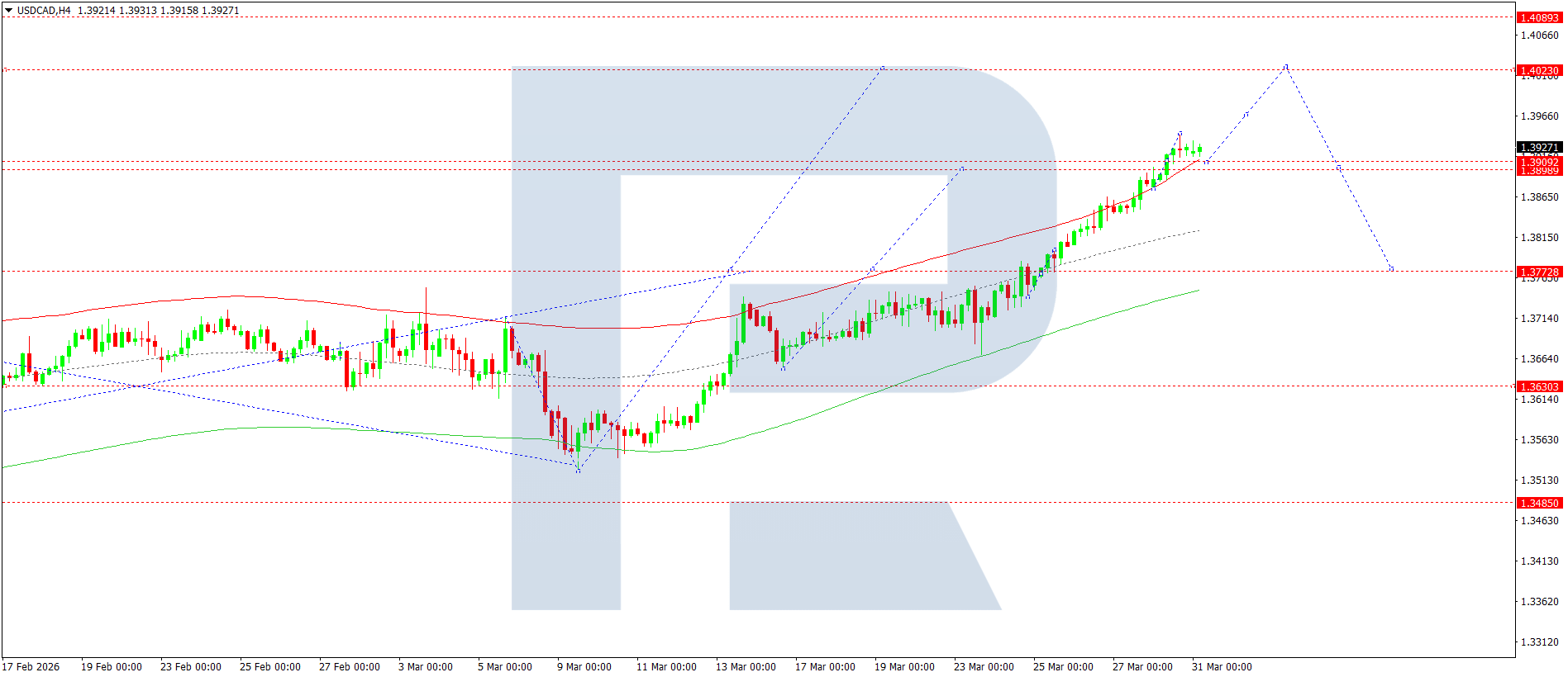 บนกราฟ H4 ของคู่เงิน USDCAD ตลาดได้เสร็จสิ้นโครงสร้างคลื่นขาขึ้นไปที่ 1.3940 วันนี้ 31 มีนาคม 2026 ไม่ตัดความเป็นไปได้ของการปรับฐานลงไปยัง 1.3911 ก่อน จากนั้นคาดว่าจะปรับตัวขึ้นไปยัง 1.4020