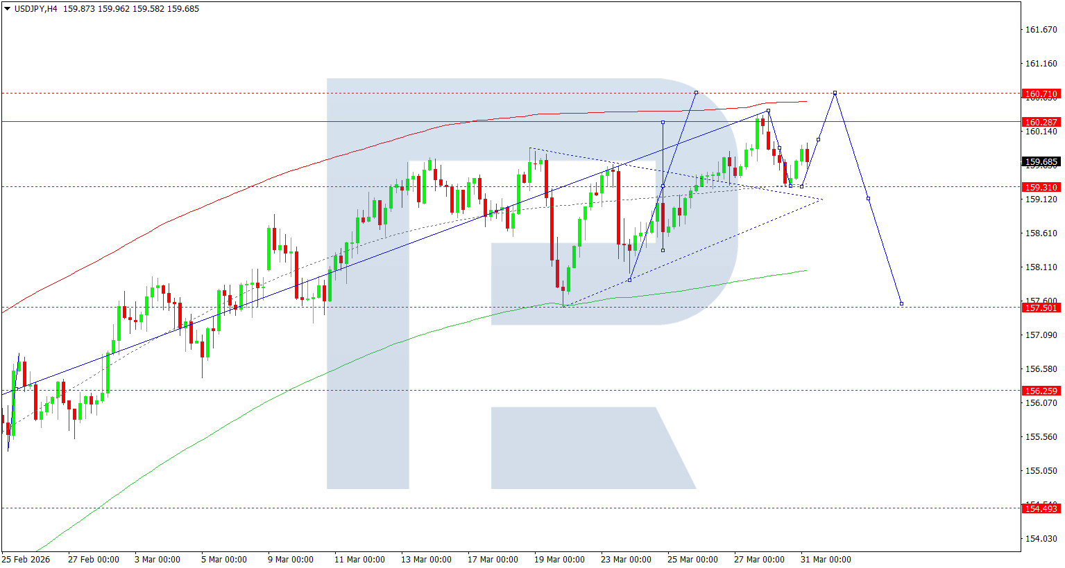 ตัวชี้วัดทางเทคนิคสำหรับการคาดการณ์ USDJPY วันนี้ชี้ถึงการปรับฐานไปยัง 159.00 ก่อนปรับตัวขึ้นไปยัง 160.70