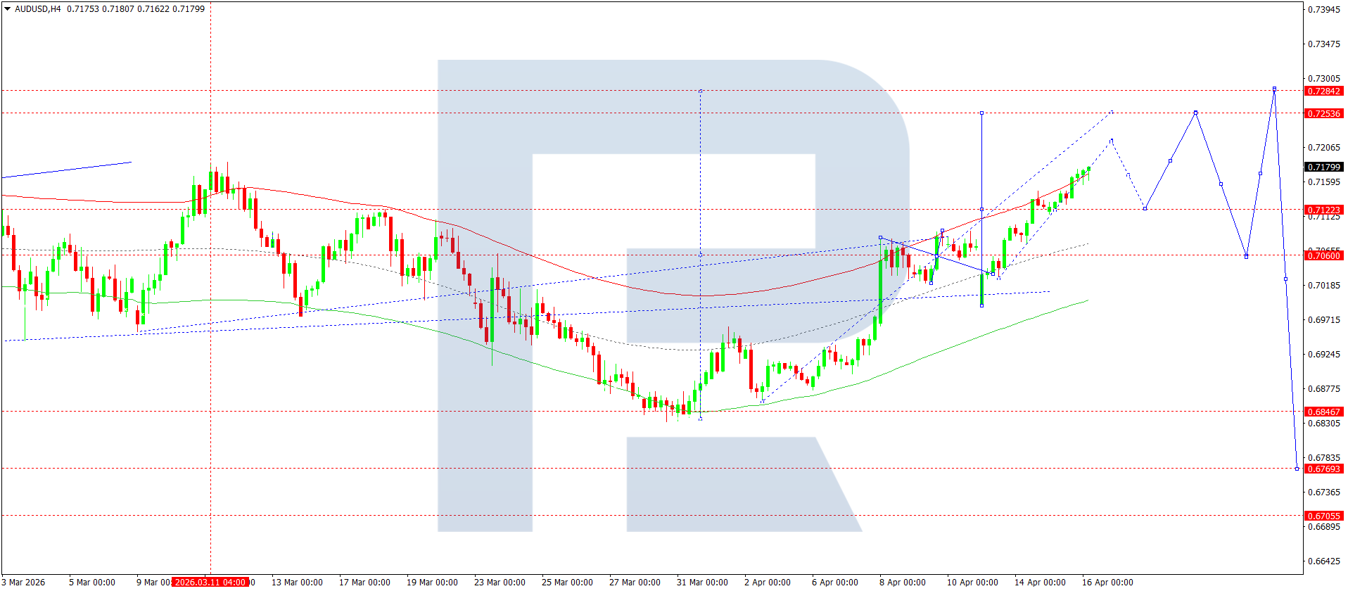 บนกราฟ H4 ของคู่เงิน AUDUSD ตลาดได้ก่อตัวช่วงการแกว่งตัวสะสมรอบระดับ 0.7122 และหลังจากทะลุขึ้น ได้เสร็จสิ้นคลื่นไปที่ 0.7190 วันนี้ 16 เมษายน 2026 คาดว่าการปรับตัวขึ้นจะดำเนินต่อไปยัง 0.7216 หากทะลุเหนือระดับนี้ จะเปิดโอกาสให้ปรับตัวขึ้นต่อไปยัง 0.7282