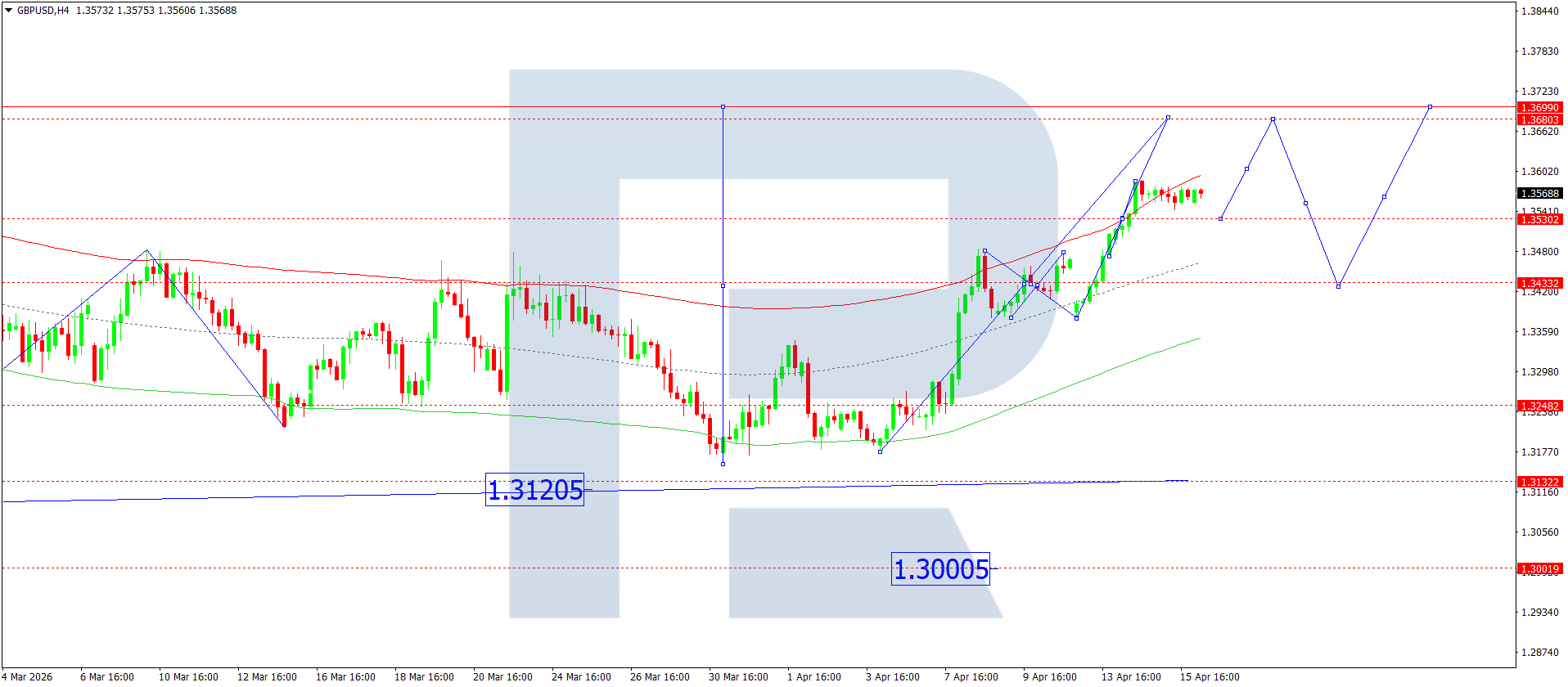 บนกราฟ H4 ของคู่เงิน GBPUSD ตลาดยังคงพัฒนาช่วงการแกว่งตัวสะสมรอบระดับ 1.3530 วันนี้ 16 เมษายน 2026 คาดว่าราคาจะทะลุขึ้นจากช่วงดังกล่าว ซึ่งจะเปิดทางให้เกิดคลื่นขาขึ้นไปที่ 1.3680 พร้อมโอกาสขยายตัวต่อไปยัง 1.3690