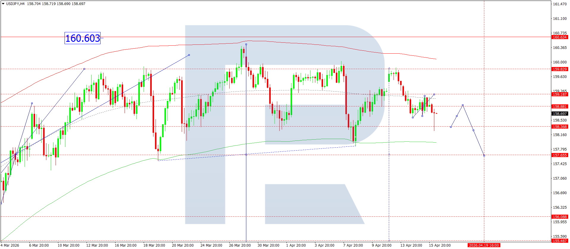 บนกราฟ H4 ของคู่เงิน USDJPY ตลาดได้เสร็จสิ้นคลื่นขาลงไปที่ 158.38 วันนี้ 16 เมษายน 2026 กำลังพัฒนาเป็นคลื่นขาขึ้นไปที่ 158.88 จากนั้นมีโอกาสเกิดคลื่นขาลงไปที่ 157.65 และอาจต่อเนื่องไปยัง 156.00