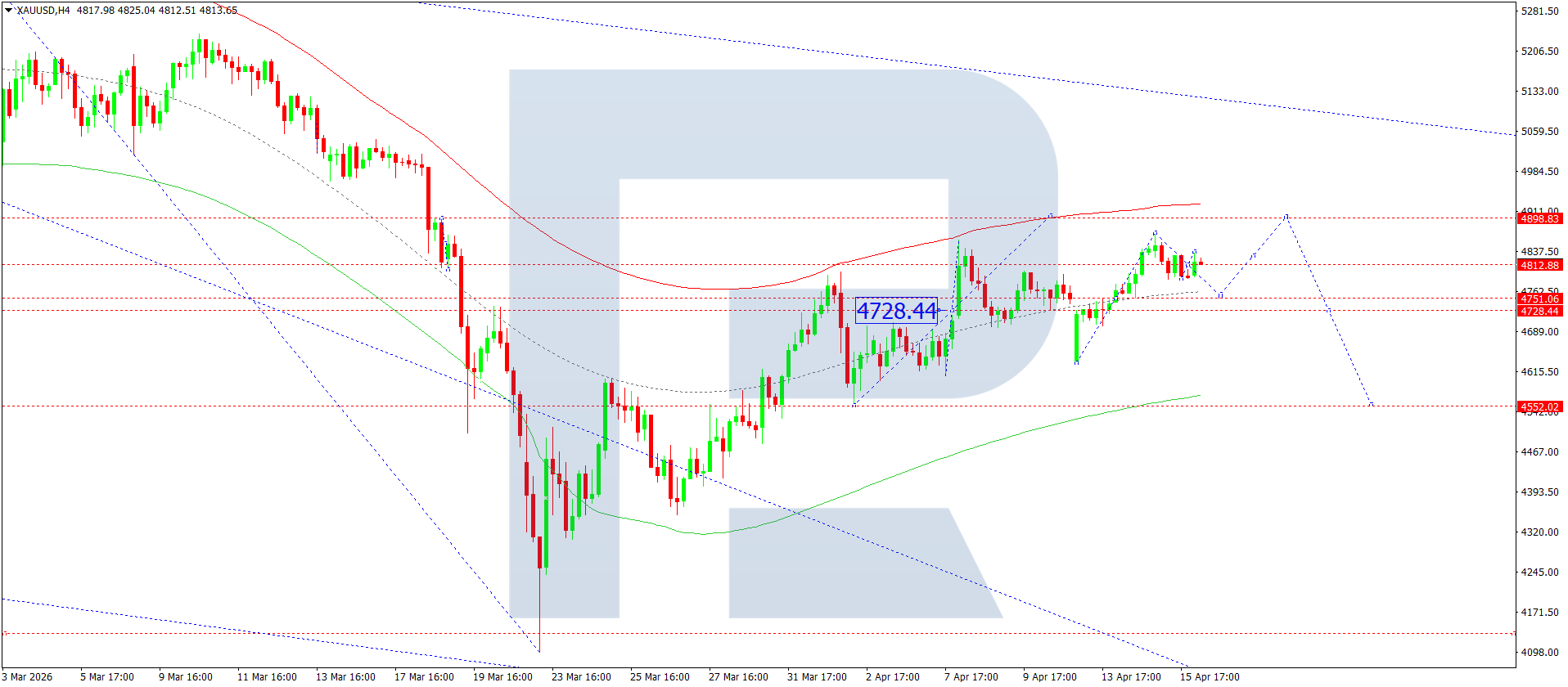 บนกราฟ H4 ของ XAUUSD ตลาดกำลังก่อตัวช่วงการแกว่งตัวสะสมรอบระดับ 4,812 วันนี้ 16 เมษายน 2026 คาดว่าราคาจะปรับตัวลงไปที่ 4,755 ก่อนจะปรับตัวขึ้นไปที่ 4,8983 โดยในทางปฏิบัติกำลังก่อตัวช่วงการแกว่งตัวสะสมรอบระดับ 4,750 หากทะลุขึ้นจากช่วงนี้ จะเปิดโอกาสให้ปรับตัวขึ้นไปที่ 5,050 และอาจต่อเนื่องไปยัง 5,065 ในทางกลับกัน หากทะลุลง อาจเกิดคลื่นขาลงไปยัง 4,555 ซึ่งเป็นเป้าหมายระยะสั้น
