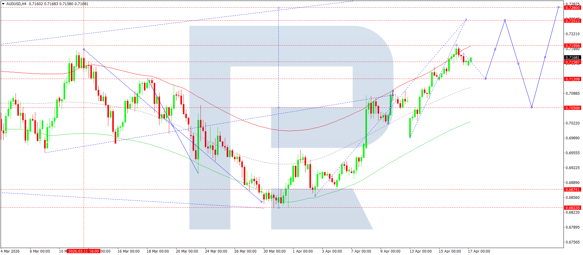 บนกราฟ H4 ของคู่เงิน AUDUSD ตลาดได้ก่อตัวช่วงการสะสมตัวรอบระดับ 0.7157 วันนี้ 17 เมษายน 2026 หากทะลุขึ้น คาดว่าจะปรับตัวขึ้นต่อไปยัง 0.7250 ในทางกลับกัน หากทะลุลงต่ำกว่า 0.7150 จะเปิดทางให้เกิดการปรับตัวลงต่อไปยัง 0.7120