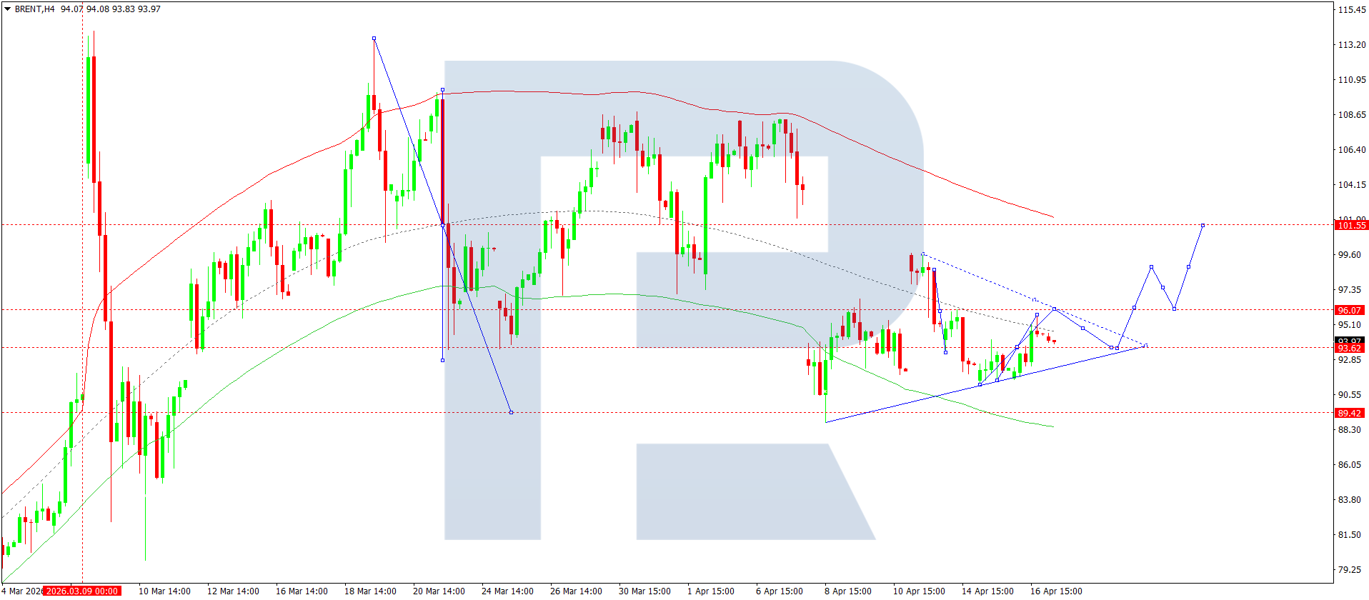 บนกราฟ H4 ของน้ำมันดิบ Brent ตลาดได้เสร็จสิ้นโครงสร้างขาลงไปที่ 93.62 วันนี้ 17 เมษายน 2026 คาดว่าจะเกิดช่วงการสะสมตัวเหนือระดับนี้ หากทะลุขึ้น จะเปิดโอกาสให้ปรับตัวขึ้นไปที่ 101.50 พร้อมแนวโน้มต่อเนื่องไปยัง 110.00 ซึ่งเป็นเป้าหมายระยะสั้น ในทางกลับกัน หากทะลุลง อาจเกิดการปรับฐานไปยัง 90.50 ก่อนจะปรับตัวขึ้นไปยัง 110.00