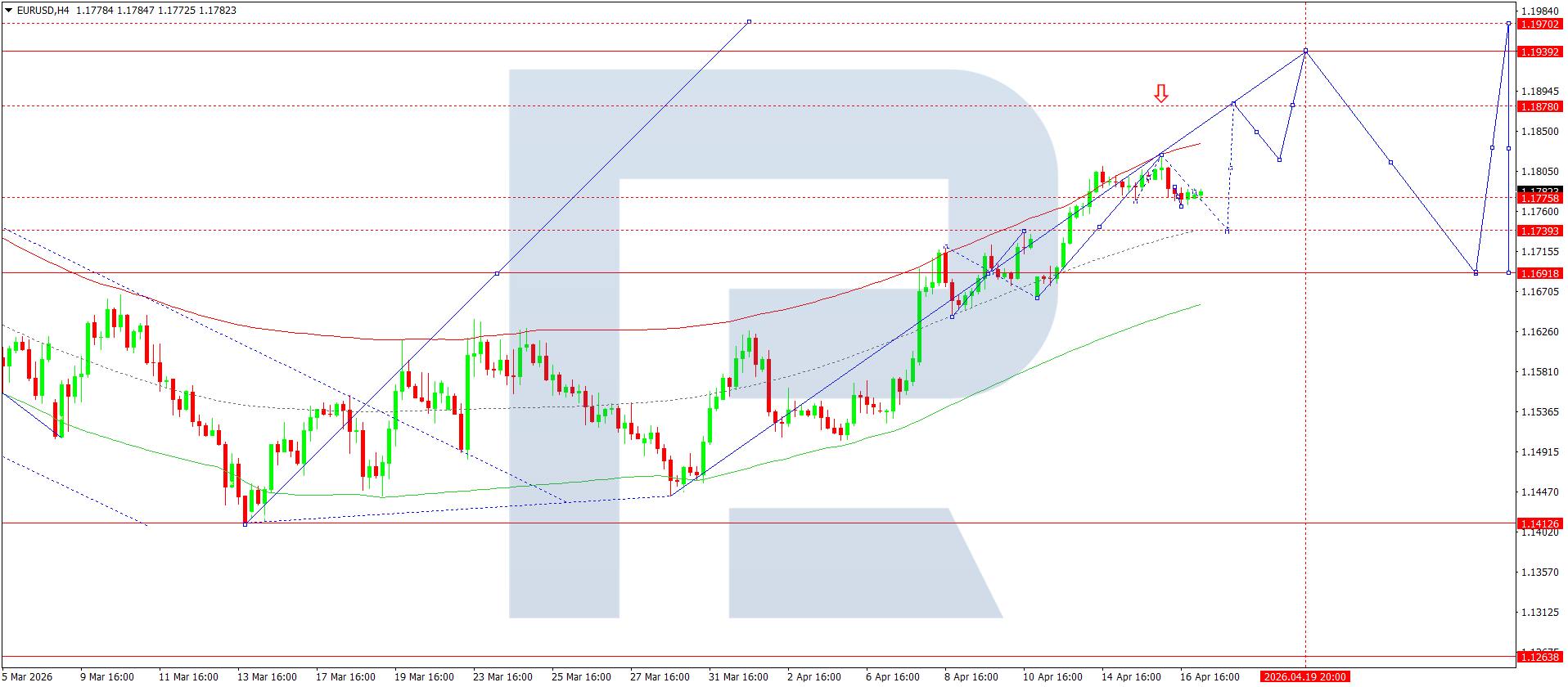 บนกราฟ H4 ของคู่เงิน EURUSD ตลาดได้ก่อตัวช่วงการสะสมตัวรอบระดับ 1.1777 วันนี้ 17 เมษายน 2026 หากราคาทะลุขึ้นเหนือ 1.1800 คาดว่าจะปรับตัวขึ้นไปที่ 1.1877 และอาจต่อเนื่องไปยัง 1.1940 ในกรณีที่ราคาทะลุลงต่ำกว่า 1.1766 คาดว่าจะเกิดคลื่นขาลงไปที่ 1.1737