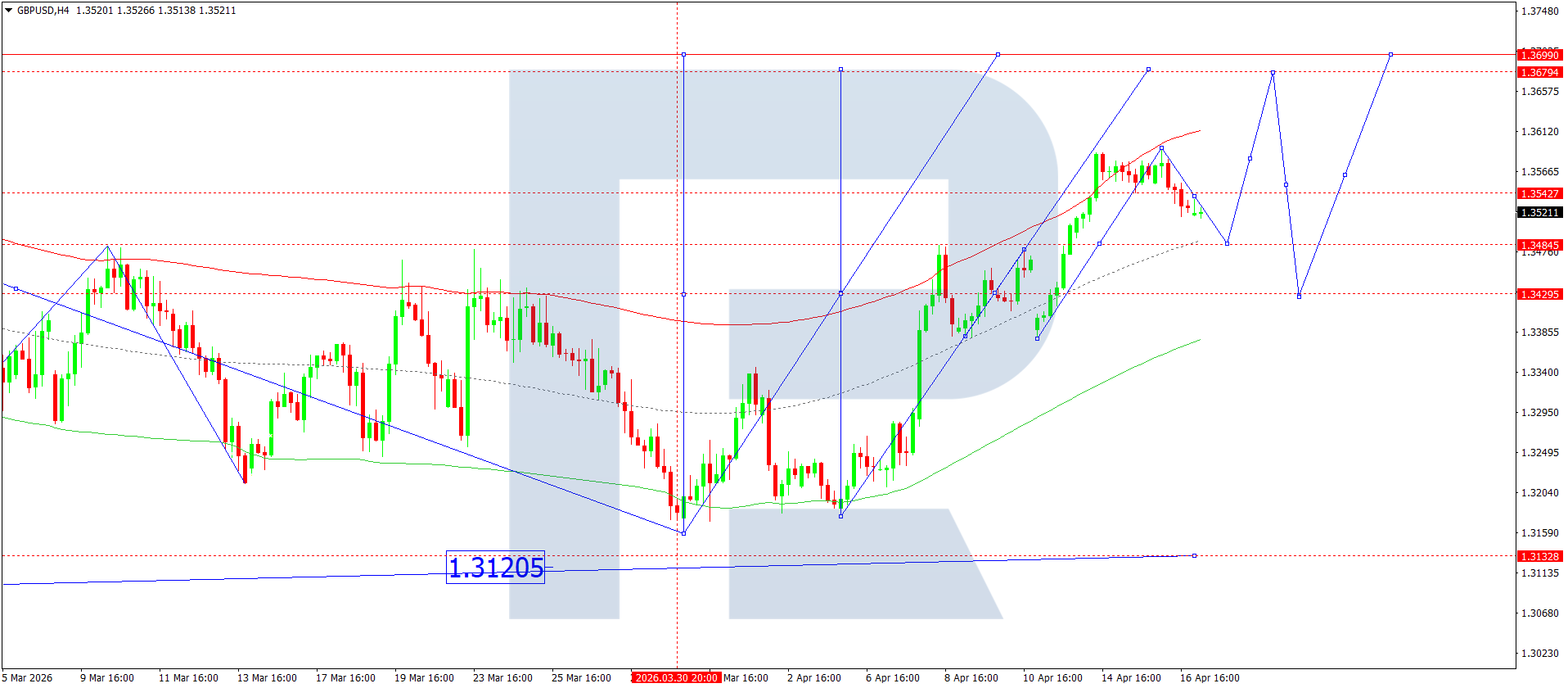 บนกราฟ H4 ของคู่เงิน GBPUSD ตลาดยังคงพัฒนาช่วงการสะสมตัวรอบระดับ 1.3545 วันนี้ 17 เมษายน 2026 คาดว่าราคาจะทะลุลงจากช่วงดังกล่าว ซึ่งจะเปิดทางให้ปรับตัวลงไปที่ 1.3484 พร้อมโอกาสต่อเนื่องไปยัง 1.3420