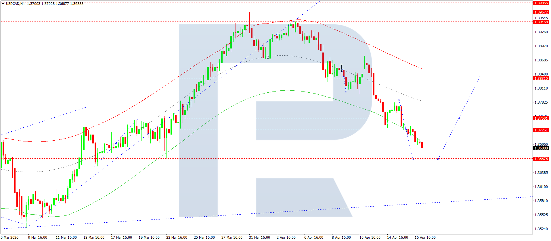 บนกราฟ H4 ของคู่เงิน USDCAD ตลาดได้เสร็จสิ้นโครงสร้างขาลงไปที่ 1.3726 วันนี้ 17 เมษายน 2026 ได้เกิดช่วงการสะสมตัวเหนือระดับนี้แล้ว การทะลุลงเปิดโอกาสให้ปรับตัวลงไปที่ 1.3666 หลังจากนั้นคาดว่าจะปรับตัวขึ้นไปที่ 1.3835 พร้อมโอกาสต่อเนื่องไปยัง 1.4025