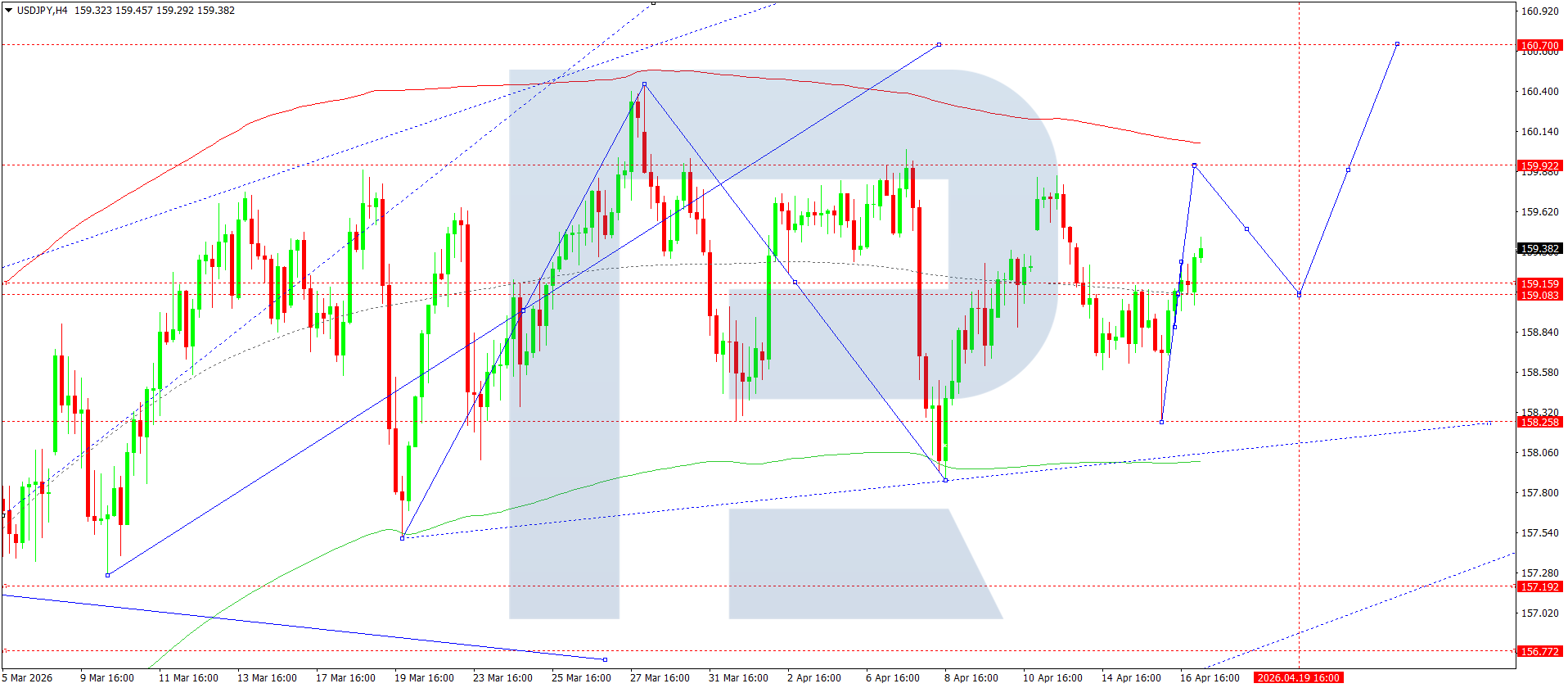 บนกราฟ H4 ของคู่เงิน USDJPY ตลาดได้เสร็จสิ้นคลื่นขาลงไปที่ 158.00 วันนี้ 17 เมษายน 2026 กำลังพัฒนาเป็นคลื่นขาขึ้นไปที่ 159.92 จากนั้นอาจเกิดคลื่นขาลงไปที่ 159.00 ก่อนจะปรับตัวขึ้นต่อไปที่ 160.70