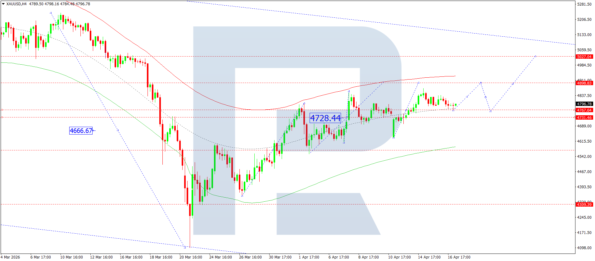 บนกราฟ H4 ของ XAUUSD ตลาดกำลังก่อตัวช่วงการสะสมตัวรอบระดับ 4,767 วันนี้ 17 เมษายน 2026 คาดว่าราคาจะปรับตัวขึ้นไปที่ 4,898 โดยในทางปฏิบัติกำลังก่อตัวช่วงการสะสมตัวรอบระดับ 4,767 หากทะลุขึ้น จะเปิดโอกาสให้ปรับตัวขึ้นไปที่ 5,050 และอาจต่อเนื่องไปยัง 5,065 ในทางกลับกัน หากทะลุลง อาจเกิดคลื่นขาลงไปยัง 4,555 ซึ่งเป็นเป้าหมายระยะสั้น