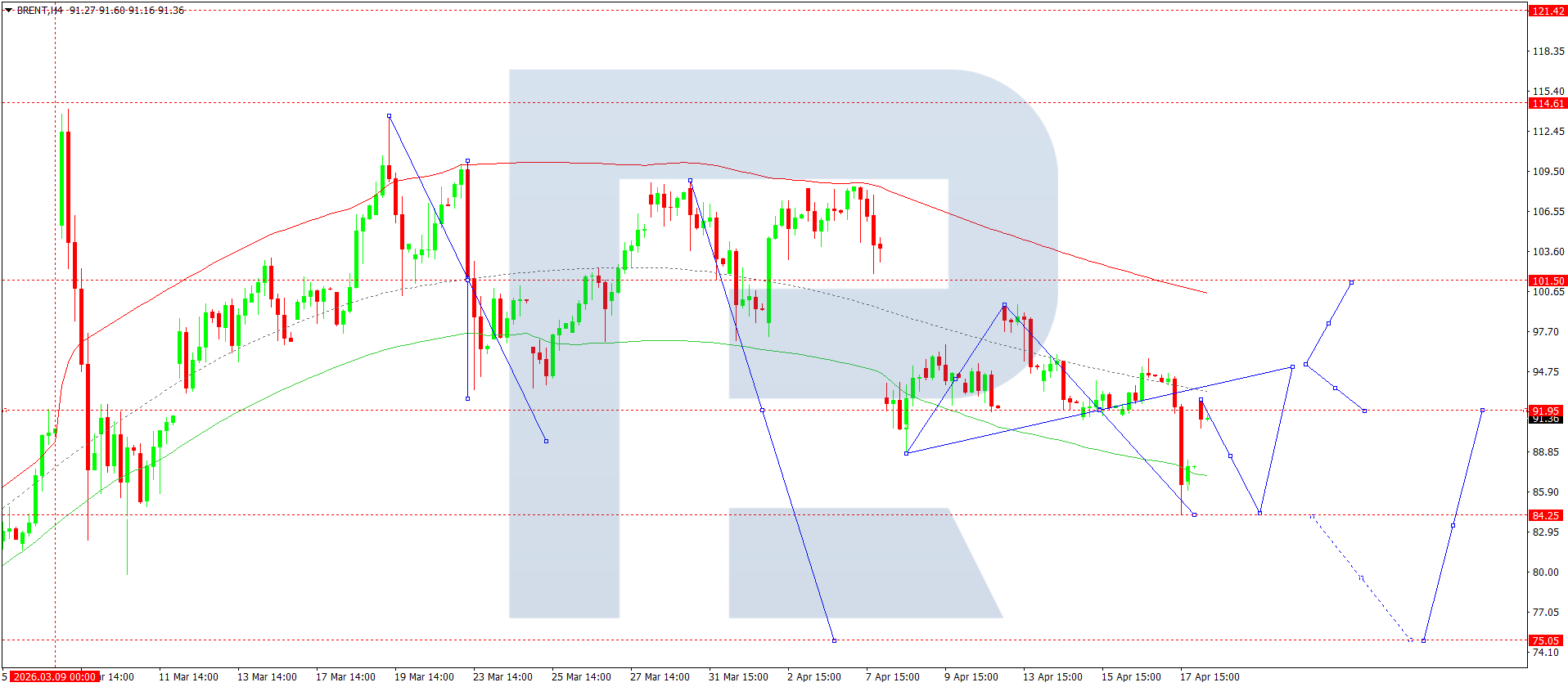 บนกราฟ H4 ของน้ำมันดิบ Brent ตลาดได้เสร็จสิ้นโครงสร้างขาลงไปที่ 84.25 วันนี้ 20 เมษายน 2026 อาจเกิดการปรับตัวขึ้นไปที่ 92.00 พร้อมกับการก่อตัวของช่วงการสะสมตัวต่ำกว่าระดับนี้ หากทะลุขึ้นจากช่วงดังกล่าว จะเปิดโอกาสให้ปรับตัวขึ้นไปที่ 101.50 และอาจต่อเนื่องไปยัง 110.00 ซึ่งเป็นเป้าหมายระยะสั้น ในทางกลับกัน หากทะลุลง อาจเกิดการปรับฐานอีกครั้งไปที่ 75.00 จากนั้นคาดว่าจะปรับตัวขึ้นไปยัง 110.00