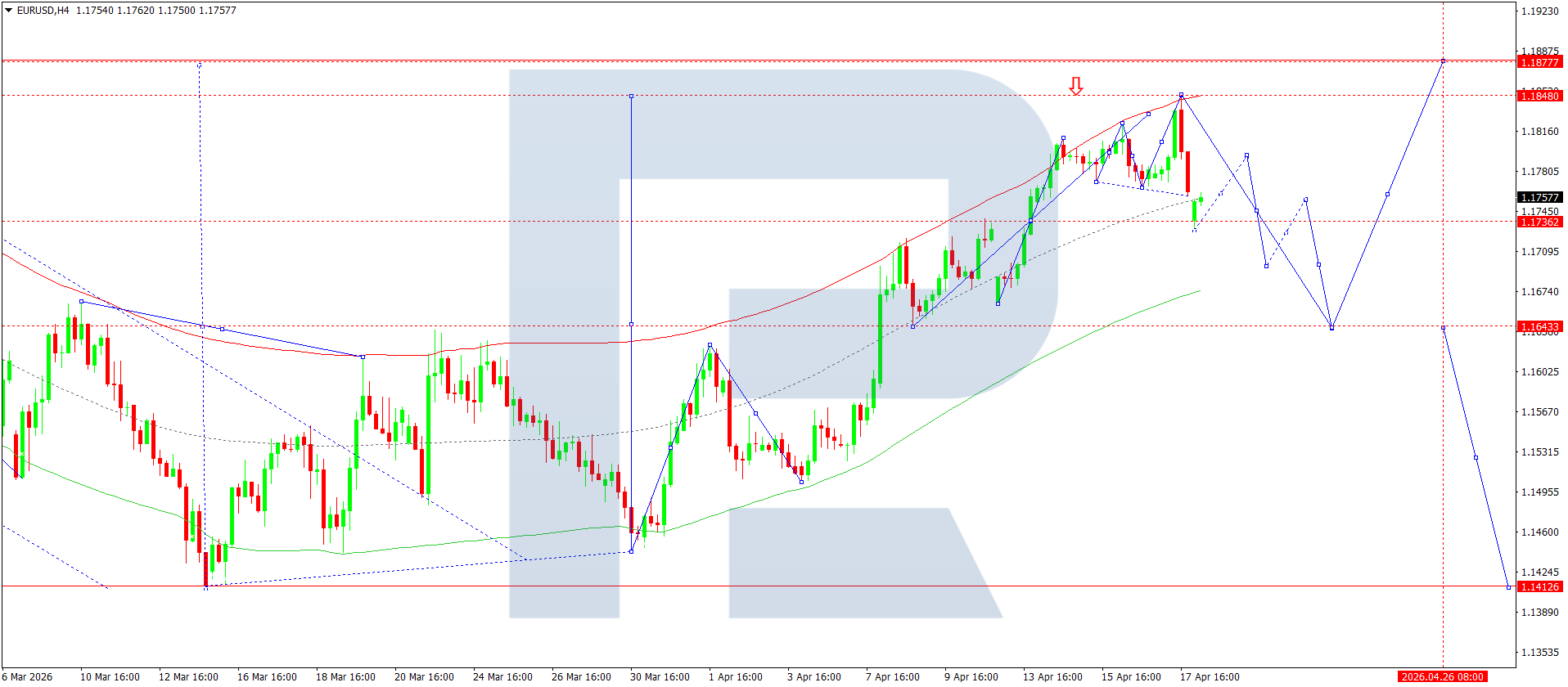 บนกราฟ H4 ของคู่เงิน EURUSD ตลาดได้ก่อตัวช่วงการสะสมตัวรอบระดับ 1.1800 และทะลุลงด้านล่าง วันนี้ 20 เมษายน 2026 คลื่นขาลงไปที่ 1.1730 ได้เสร็จสมบูรณ์แล้ว คาดว่าจะมีการปรับตัวขึ้นไปที่ 1.1760 จากนั้น หากราคาทะลุลงต่ำกว่า 1.1730 จะเปิดโอกาสให้ปรับตัวลงไปที่ 1.1690 พร้อมแนวโน้มต่อเนื่องของคลื่นขาลงไปยัง 1.1643