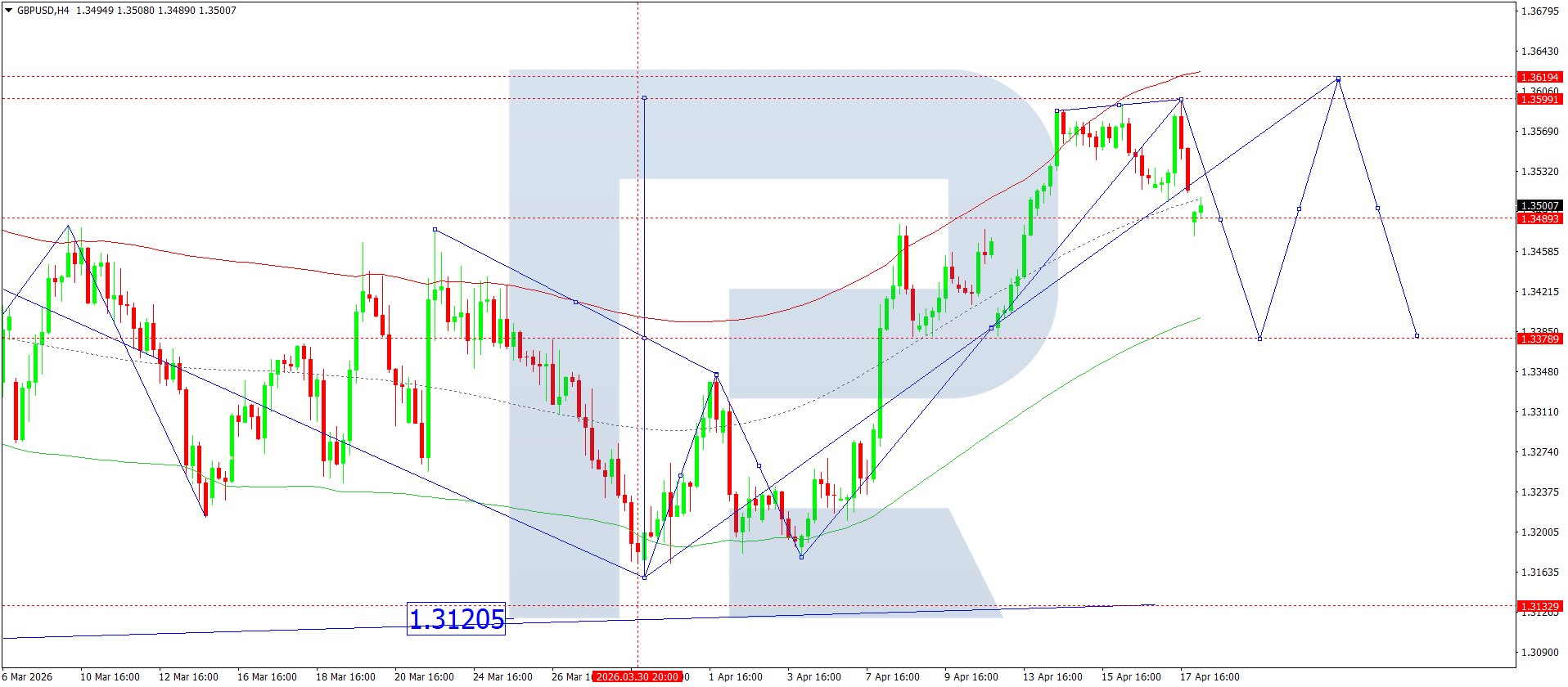 บนกราฟ H4 ของคู่เงิน GBPUSD ตลาดยังคงพัฒนาช่วงการสะสมตัวรอบระดับ 1.3555 วันนี้ 20 เมษายน 2026 คาดว่าราคาจะทะลุลงจากช่วงดังกล่าว ซึ่งจะเปิดโอกาสให้ปรับตัวลงไปที่ 1.3380 และอาจต่ำลงไปถึง 1.3340