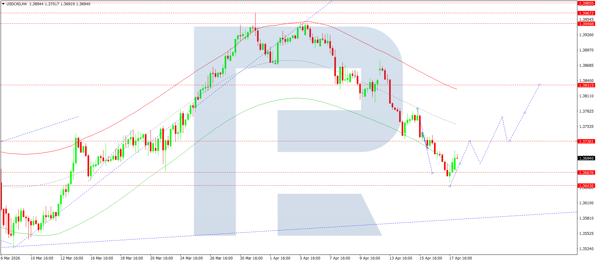 บนกราฟ H4 ของคู่เงิน USDCAD ตลาดได้เสร็จสิ้นโครงสร้างขาลงไปที่ 1.3746 วันนี้ 20 เมษายน 2026 ได้ก่อตัวช่วงการสะสมตัวเหนือระดับนี้ หากทะลุขึ้นจากช่วงดังกล่าว จะเปิดทางไปยัง 1.3727 จากนั้นคาดว่าราคาจะปรับตัวลงไปที่ 1.3688 ก่อนจะปรับตัวขึ้นไปที่ 1.3770 และอาจต่อเนื่องไปยัง 1.3830