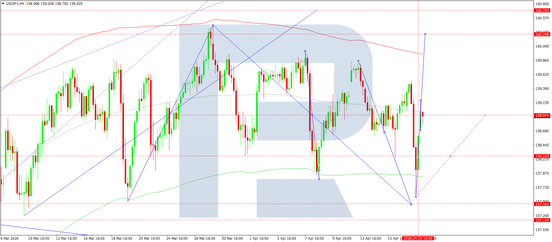 บนกราฟ H4 ของคู่เงิน USDJPY ตลาดได้เสร็จสิ้นคลื่นขาลงไปที่ 157.57 ตามด้วยการปรับตัวขึ้นไปที่ 159.18 วันนี้ 20 เมษายน 2026 กำลังพัฒนาช่วงการสะสมตัวรอบระดับ 158.90 โดยมีโอกาสที่คลื่นขาขึ้นจะดำเนินต่อไปยัง 160.30 จากนั้นคาดว่าจะปรับตัวลงกลับไปที่ 158.90